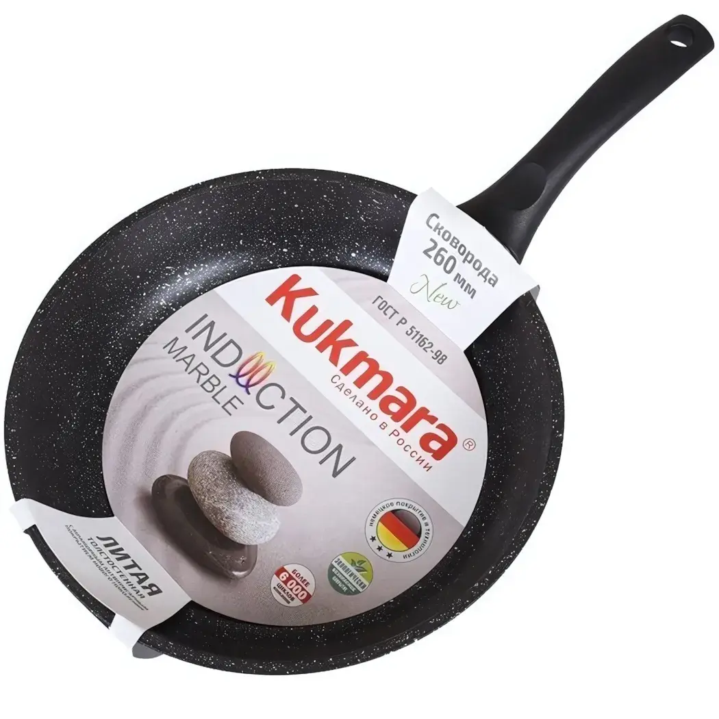 Сковорода имеет черный цвет с эффектом мрамора и удобную ручку, которая не нагревается во время готовки. Размеры сковороды: диаметр 26 см, высота 6 см. Она соответствует стандартам ГОСТ Р 51162-98 и сделана в России, что подтверждает высокое качество и надежность.