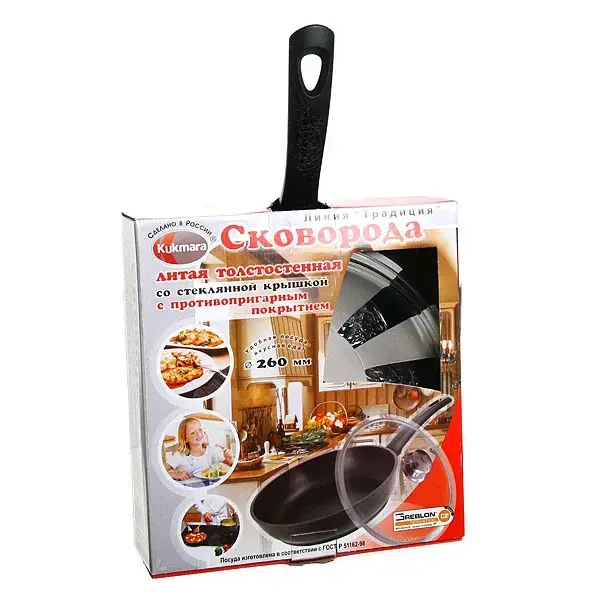 Произведено в России на заводе с 65-летней историей. Соответствует ГОСТ 51162-98 по безопасности материалов. Комплектация: сковорода, стеклянная крышка с металлическим ободком, фирменная упаковка для хранения.