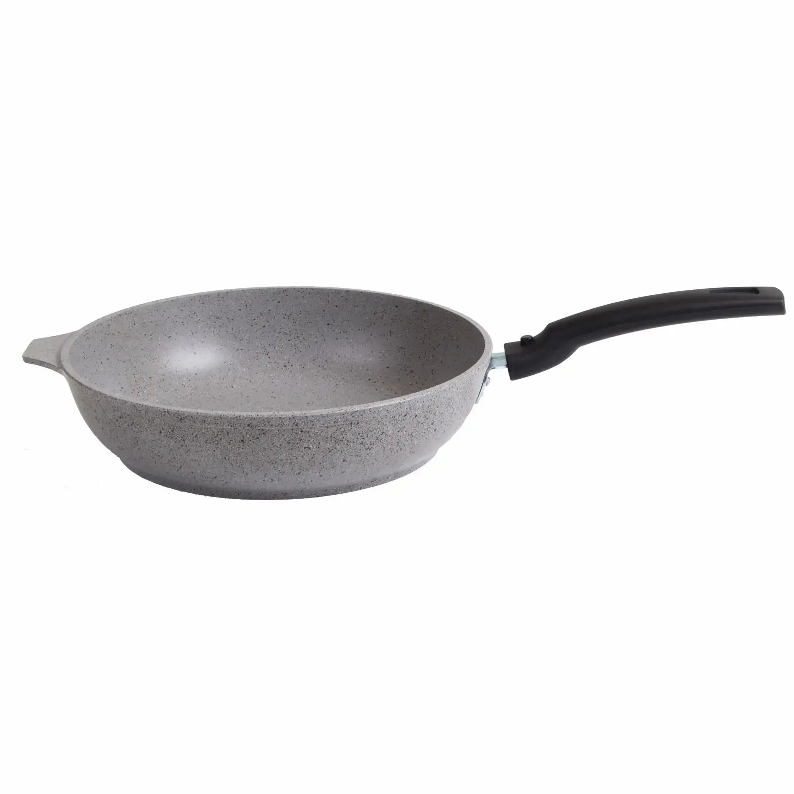 Сковорода выполнена из литого алюминия, что обеспечивает равномерное распределение тепла и предотвращает пригорание пищи. Цвет сковороды — светло-серый с мелкими черными вкраплениями, что придает ей стильный и современный вид. Пластиковая ручка черного цвета обеспечивает удобный захват и не нагревается во время готовки.