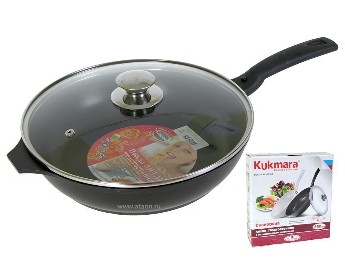 Сковорода имеет диаметр 26 см, что делает ее идеальной для приготовления порций на 2-3 человека. Крышка выполнена из прочного стекла, а ручка — из качественного пластика, что гарантирует долговечность и безопасность в использовании.