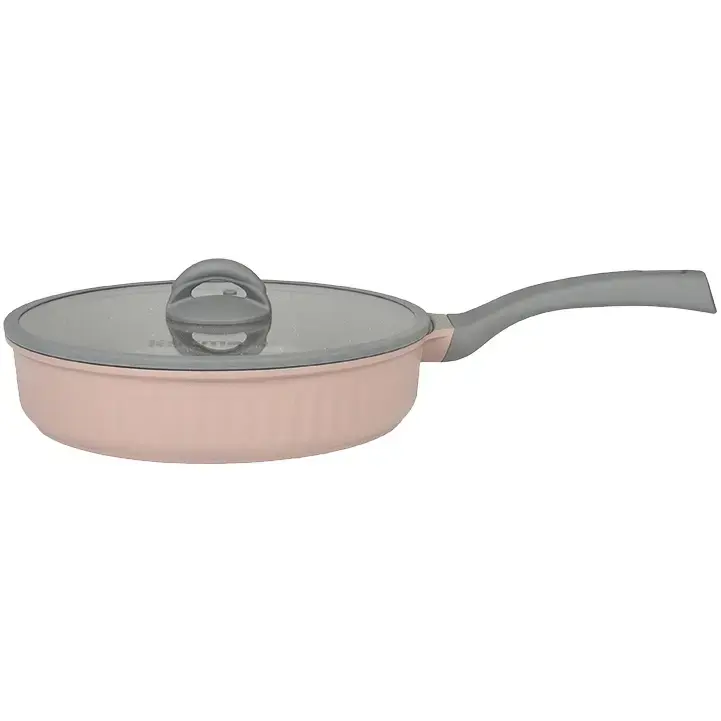 Диаметр сковороды составляет 28 см, высота борта – 6,5 см. Внутреннее антипригарное покрытие серого цвета с мраморным эффектом не только практично, но и эстетично. Специальный узор на внешних бортах способствует более эффективному распределению тепла, что позволяет экономить энергию при готовке.