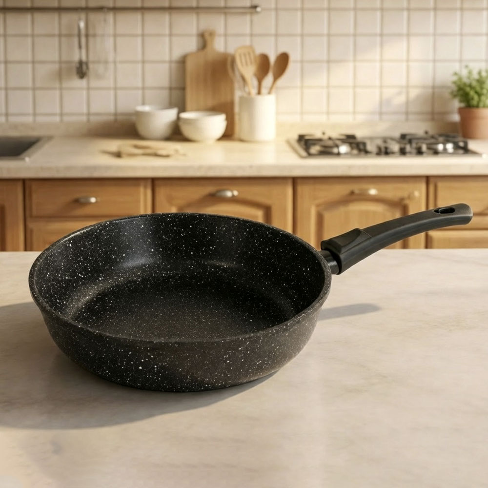 Выбирая эту сковороду, вы получаете не только качественный продукт, но и стильный элемент кухонной утвари. Черный цвет с белыми вкраплениями создает эффект гранита, что придаёт сковороде современный вид. Литой алюминий обеспечивает равномерное распределение тепла, что позволяет избежать пригорания пищи.