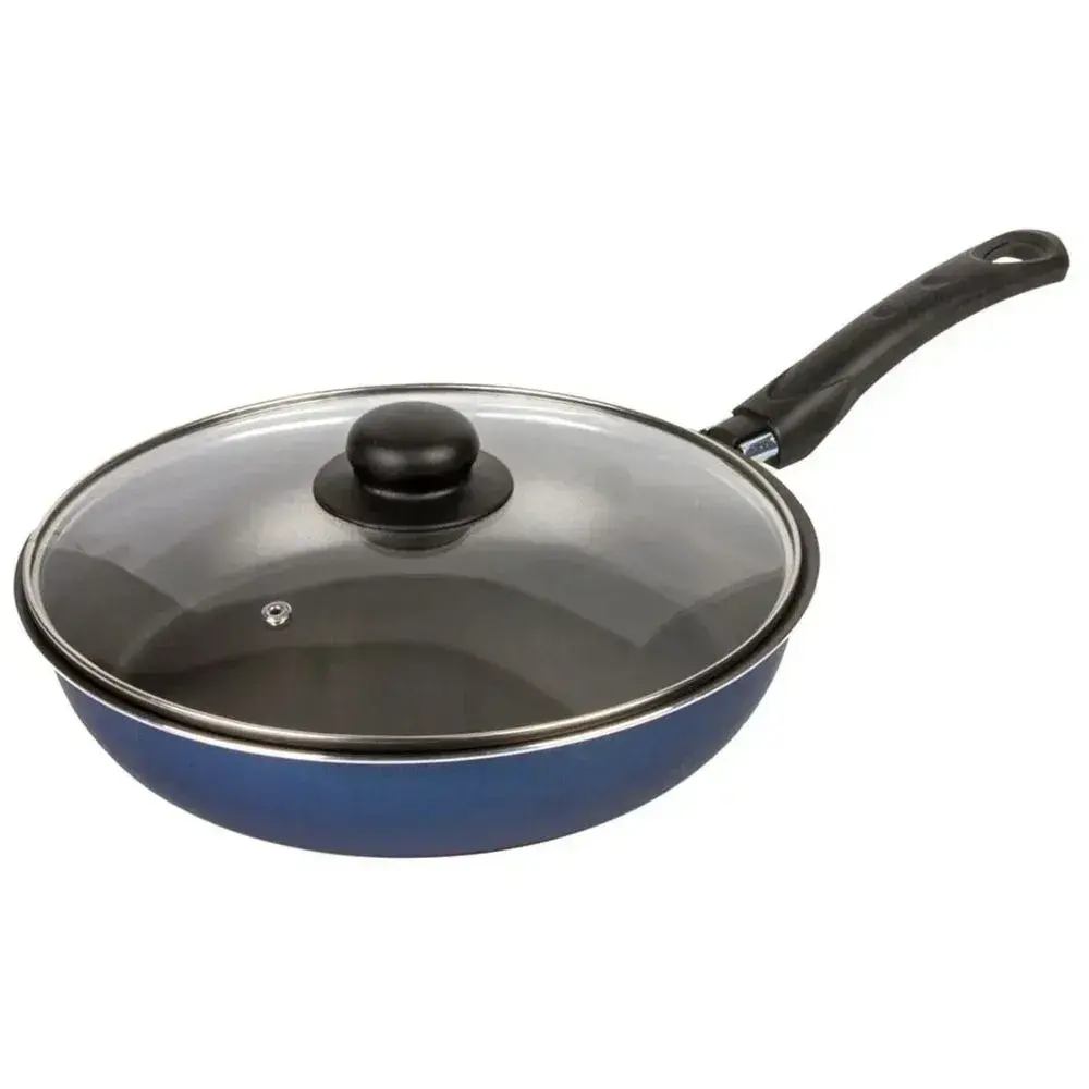 Сковорода антипригарная 22 см с крышкой 'Сатин', синяя, стеклянная крышка, пластиковая ручка