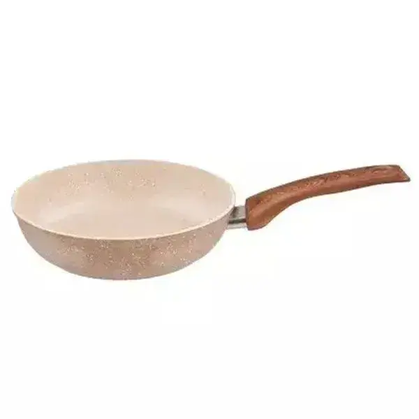 Светло-бежевое внутреннее покрытие визуально контролирует степень прожарки, а компактные габариты позволяют удобно хранить сковороду. Деревянная ручка обработана для защиты от влаги и сохраняет естественную текстуру.