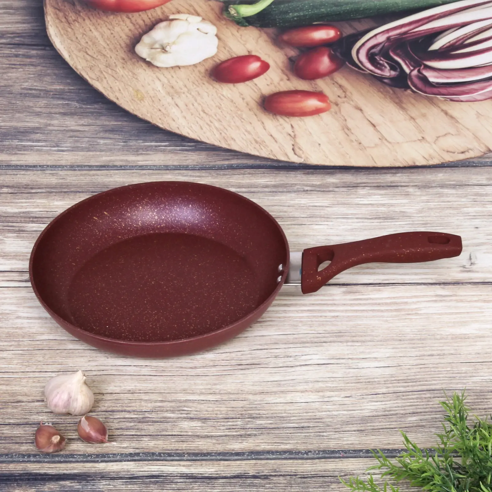 Бордовый оттенок с мерцающими вкраплениями добавит эстетики вашей кухне. Низкие бортики и гладкое дно обеспечивают комфортный переворот продуктов. Сковорода подходит для ежедневного использования и станет надежным помощником в приготовлении любимых блюд.