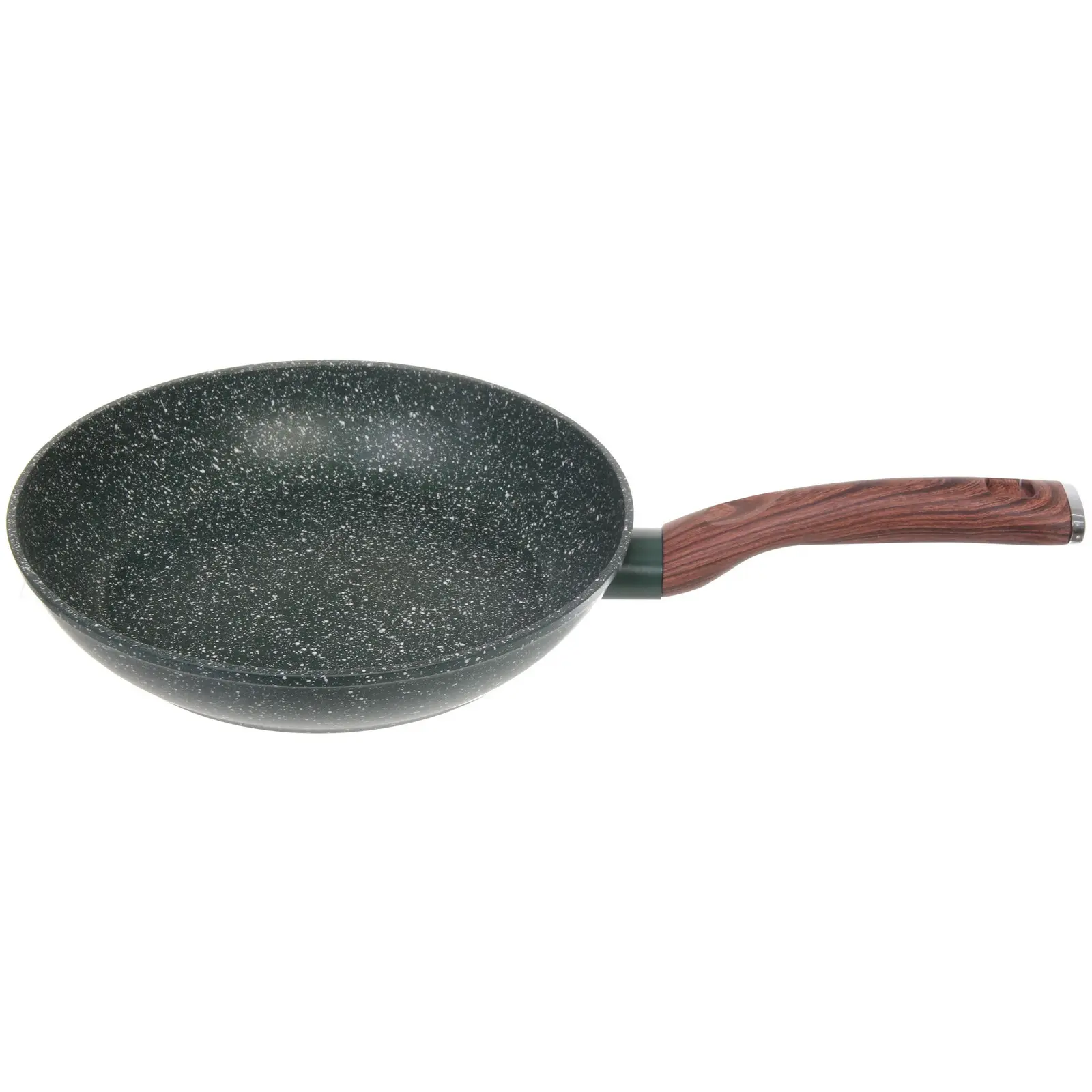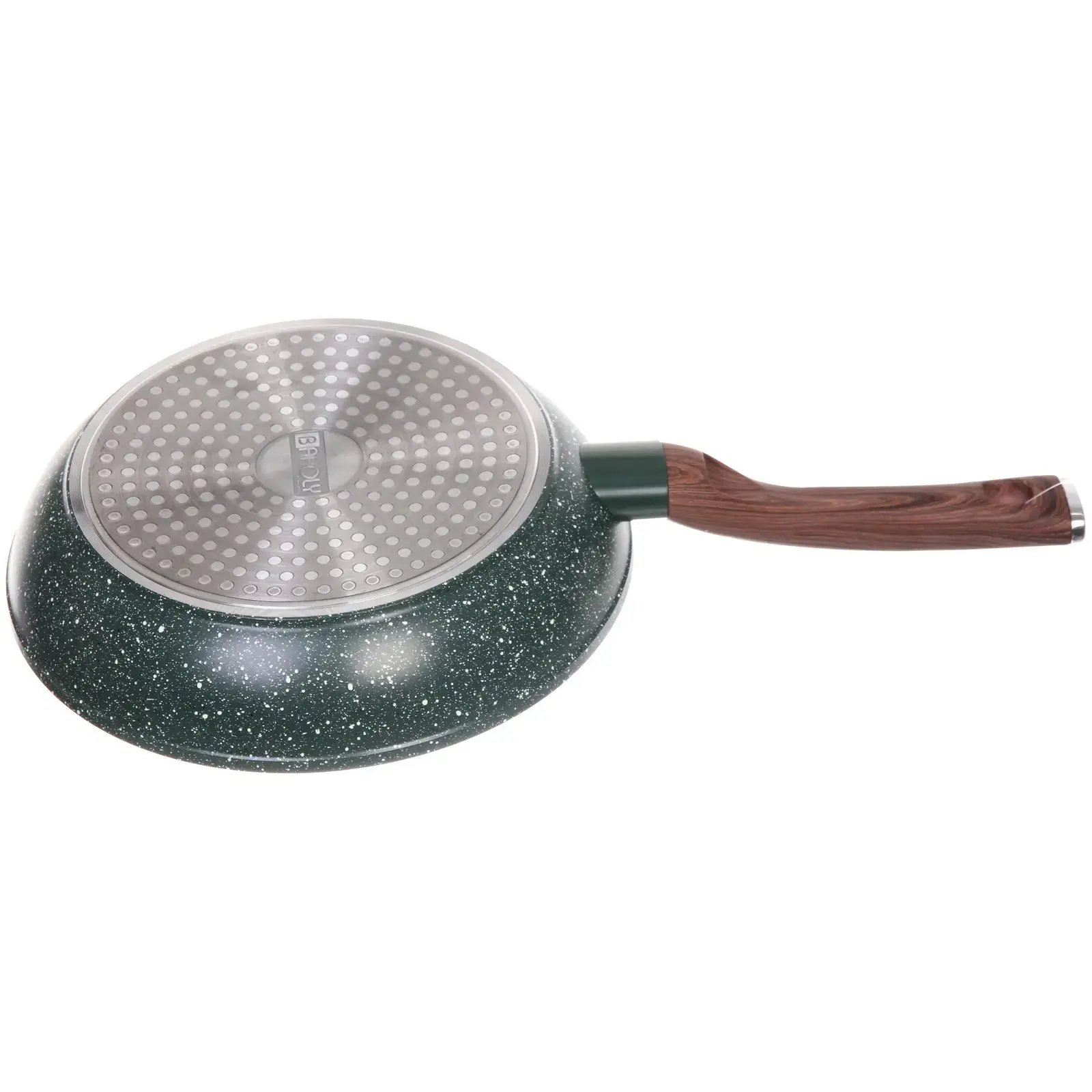 Сковорода выполнена из алюминия, что обеспечивает легкость и долговечность. Темно-зеленый цвет с белыми вкраплениями придает ей стильный вид, а гладкая поверхность облегчает уход. Размеры сковороды делают её идеальной для повседневного использования, а также для создания кулинарных шедевров на любой кухне.