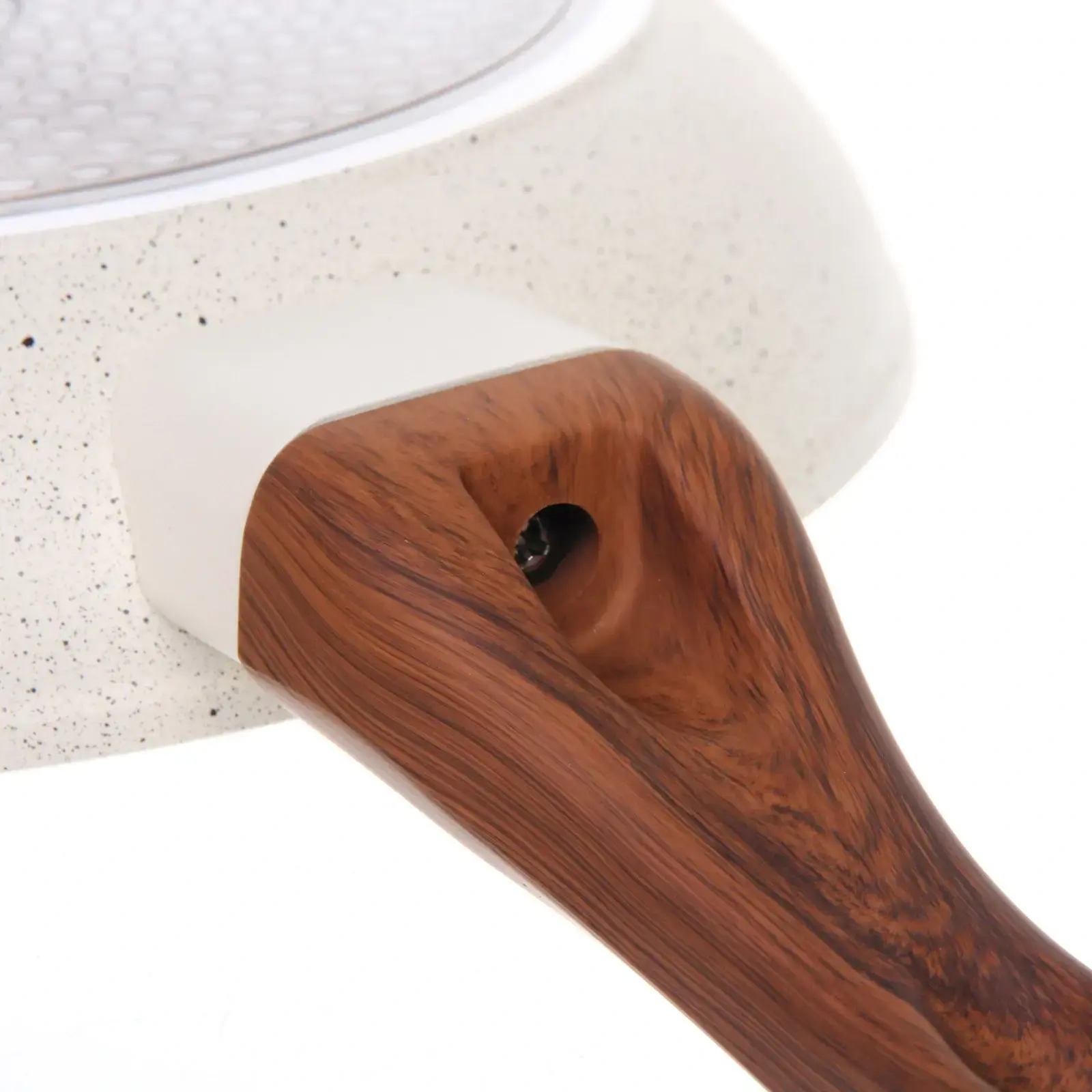 Эта сковорода идеально подходит для жарки, тушения и запекания. Она совместима с индукционными плитами, что делает её универсальным инструментом для любой кухни. Бакелитовая ручка, выполненная в стиле дерева, обеспечивает надежный и удобный хват, что позволяет вам легко управлять сковородой во время готовки.