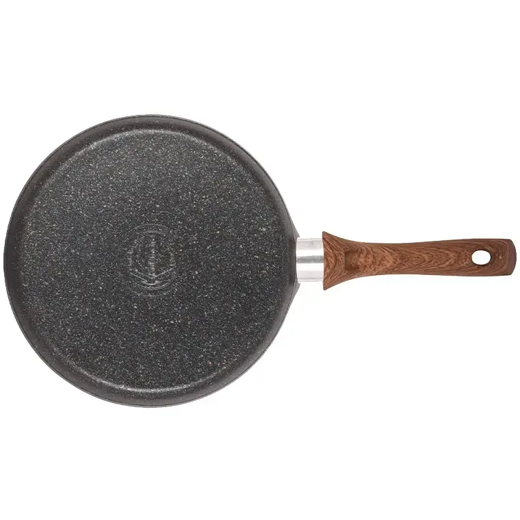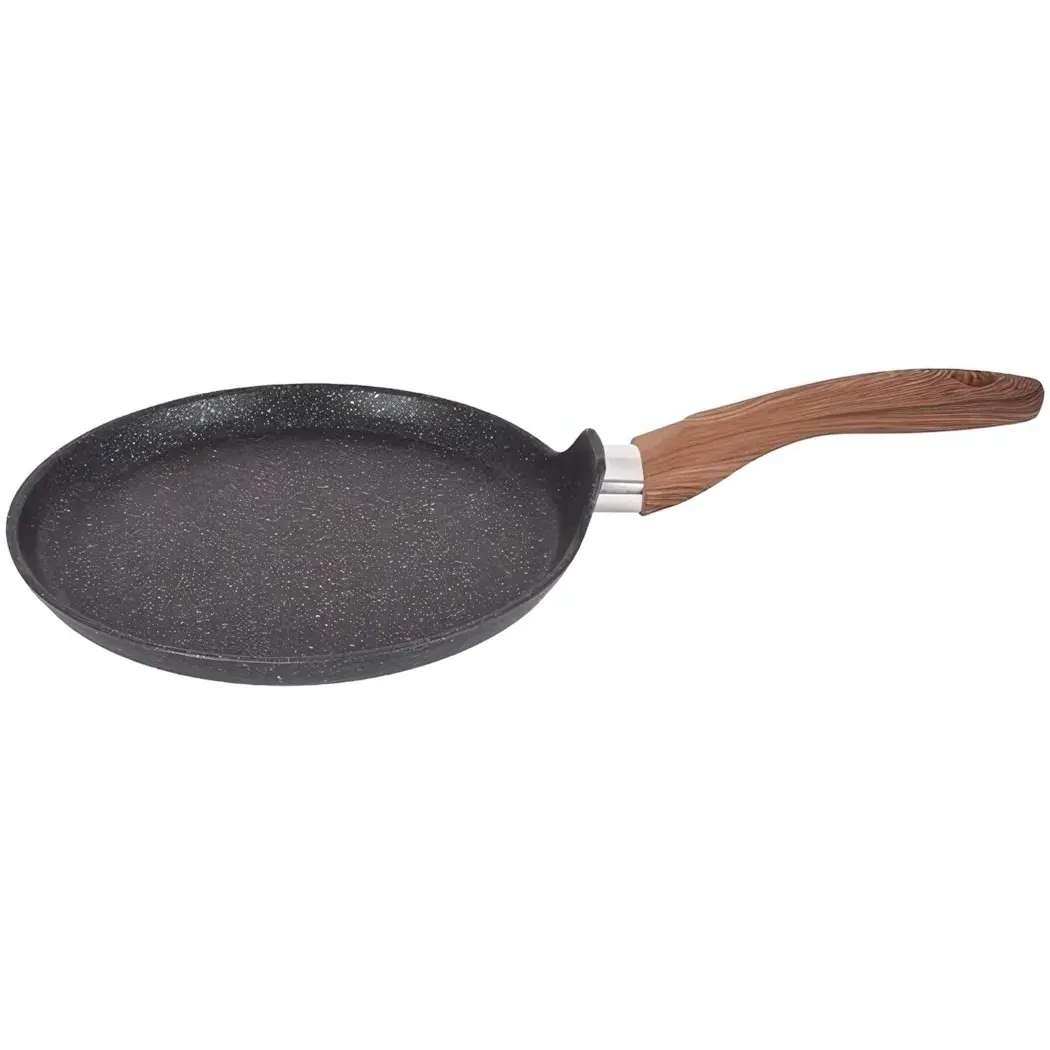 Диаметр рабочей поверхности 24 см оптимален для приготовления блинов стандартного размера. Черный цвет с гранитной текстурой и натуральная деревянная ручка создают стильный дизайн, который дополнит любой кухонный интерьер.
