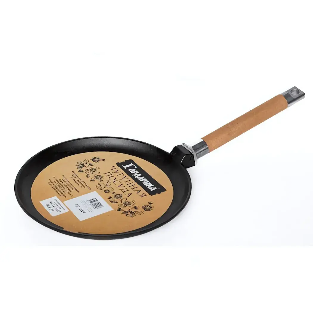 Сковорода идеально подходит для жарки блинов, оладий и других блюд. Чугун обеспечивает равномерное распределение тепла, что позволяет готовить вкусные и аппетитные блюда. Деревянная ручка обеспечивает надежный захват и не нагревается, что делает процесс готовки безопасным и удобным.