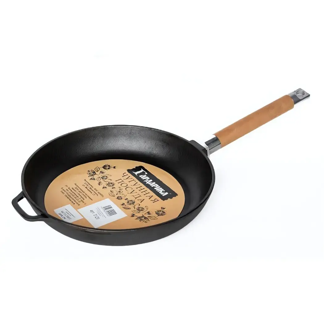Сковорода имеет диаметр 24 см и выполнена из качественного чугуна, что гарантирует равномерное распределение тепла. Черный цвет придает ей стильный вид, а деревянная ручка обеспечивает удобный захват. Эта сковорода станет отличным дополнением к вашей кухонной посуде и поможет вам готовить вкусные и полезные блюда для всей семьи.