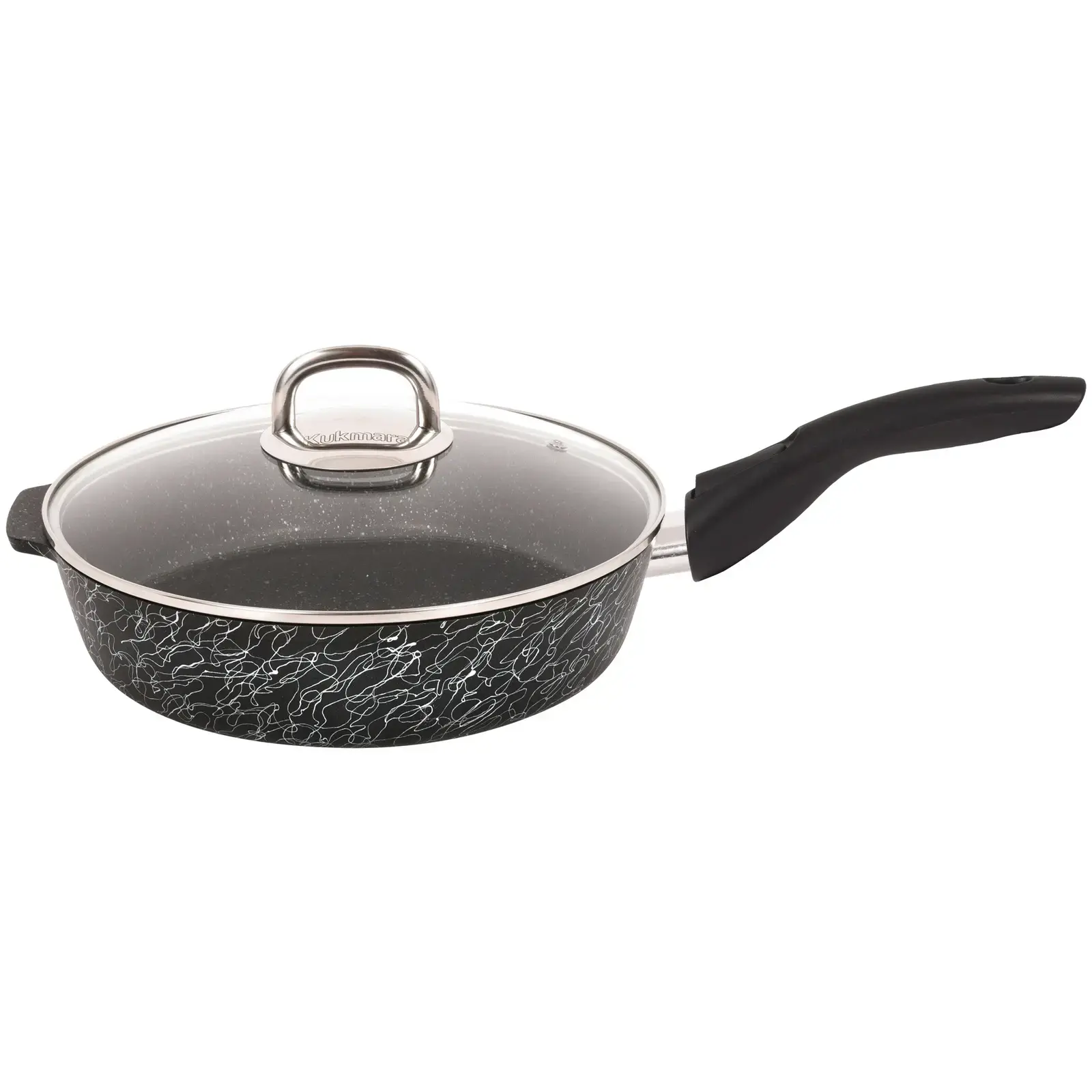 Сковорода глубокая «Грация» станет вашей надежной помощницей на кухне. Благодаря уникальному дизайну, сочетающему черный цвет с серебряными элементами, она не только функциональна, но и эстетична.
