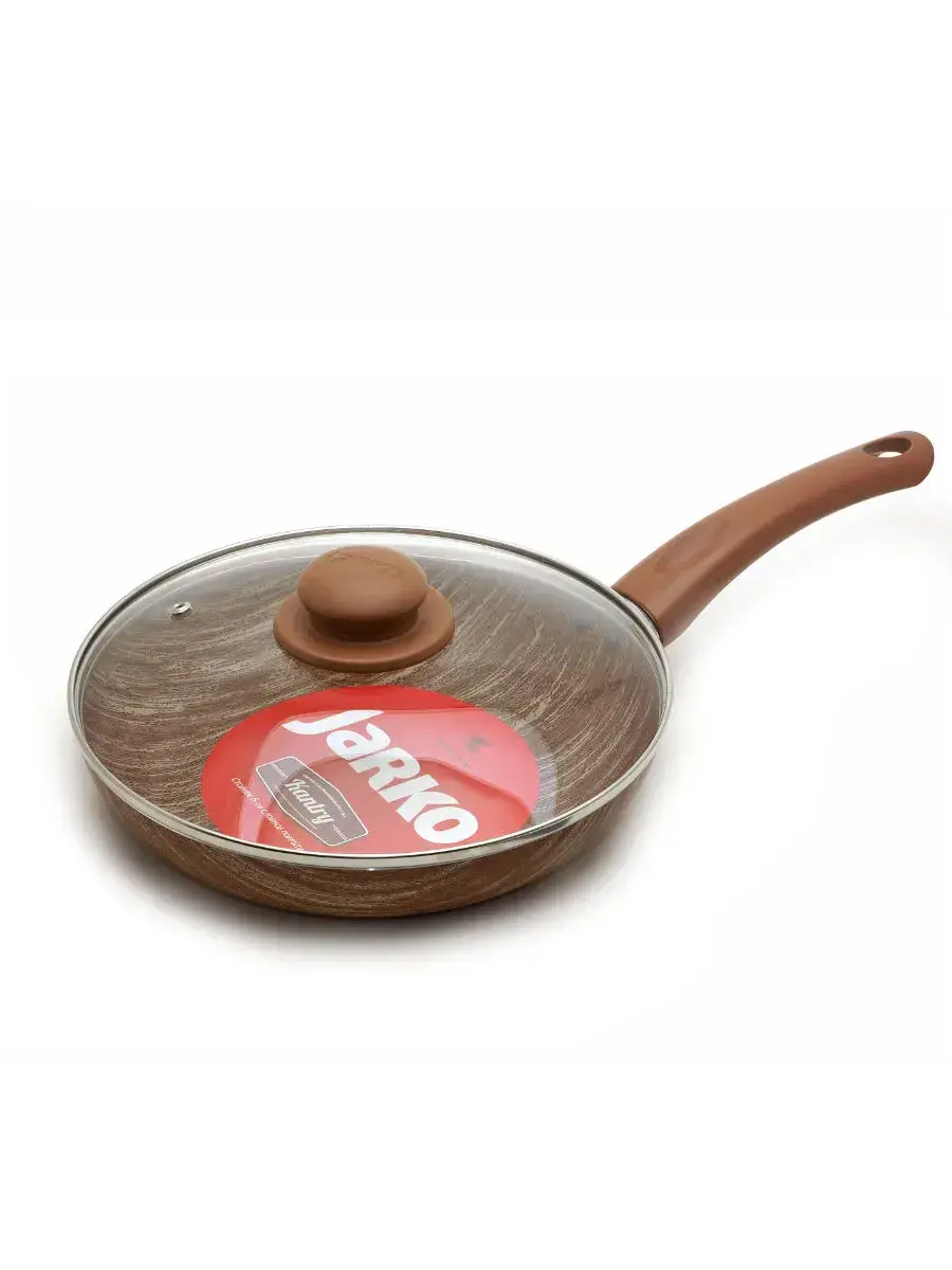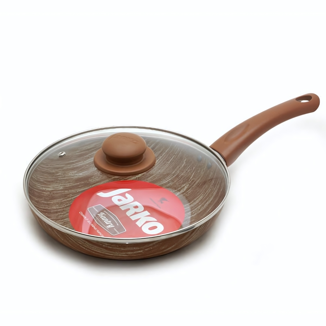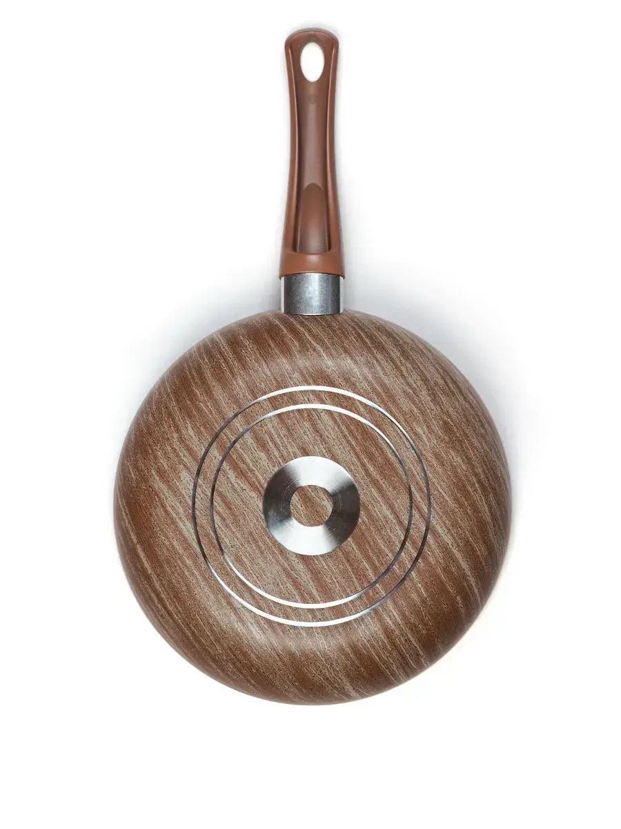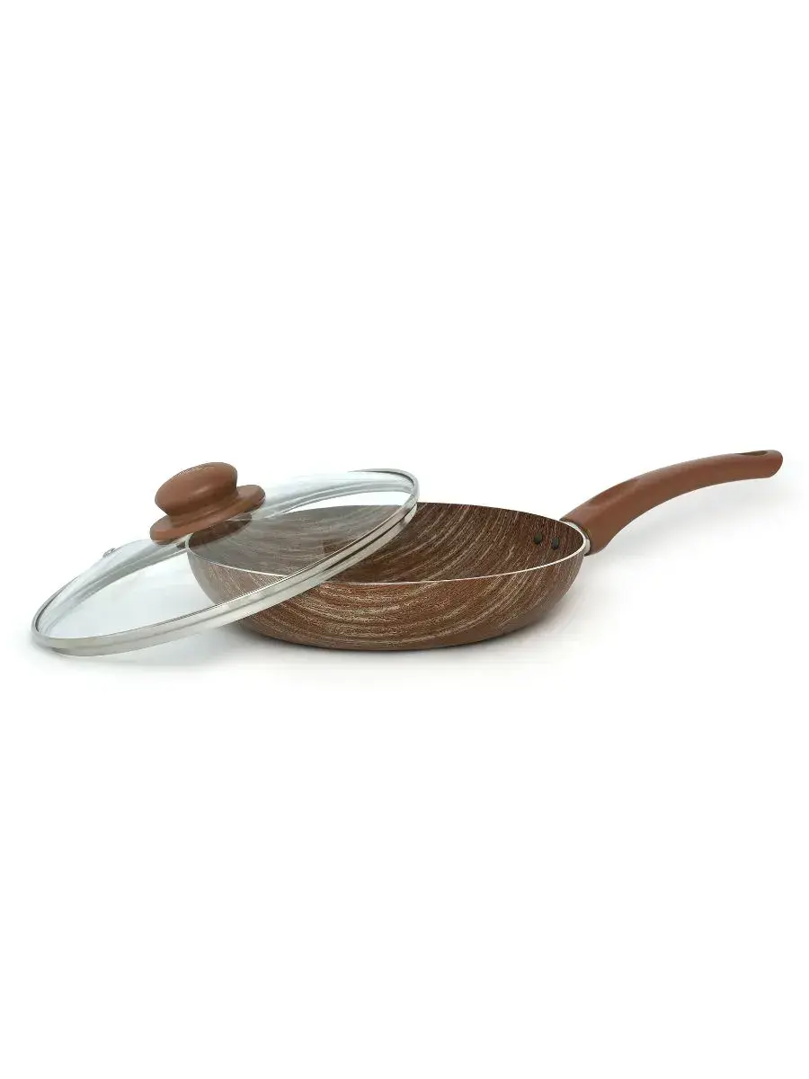 Сковорода имеет диаметр 24см и выполнена из алюминия, что обеспечивает равномерное распределение тепла. Коричневый цвет с текстурой дерева делает ее не только функциональной, но и эстетически привлекательной. Стеклянная крышка позволяет видеть процесс приготовления, а ее округлая форма и ручка в том же цвете, что и сковорода, создают гармоничный образ.