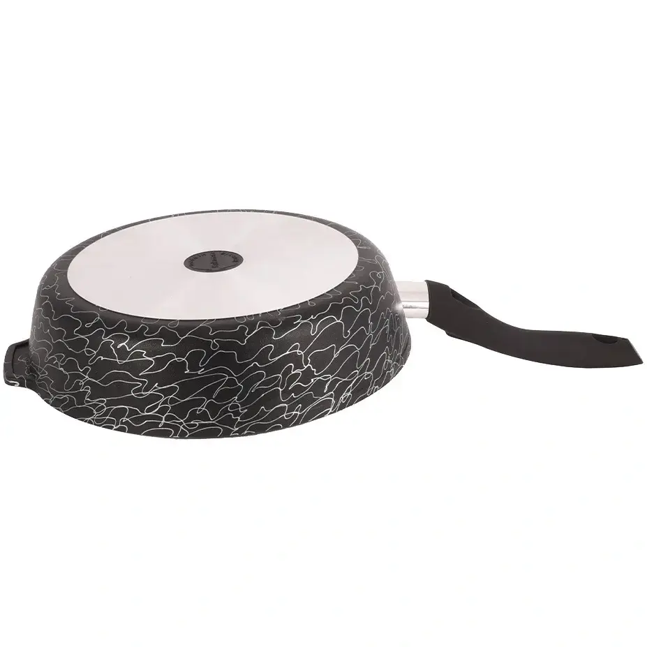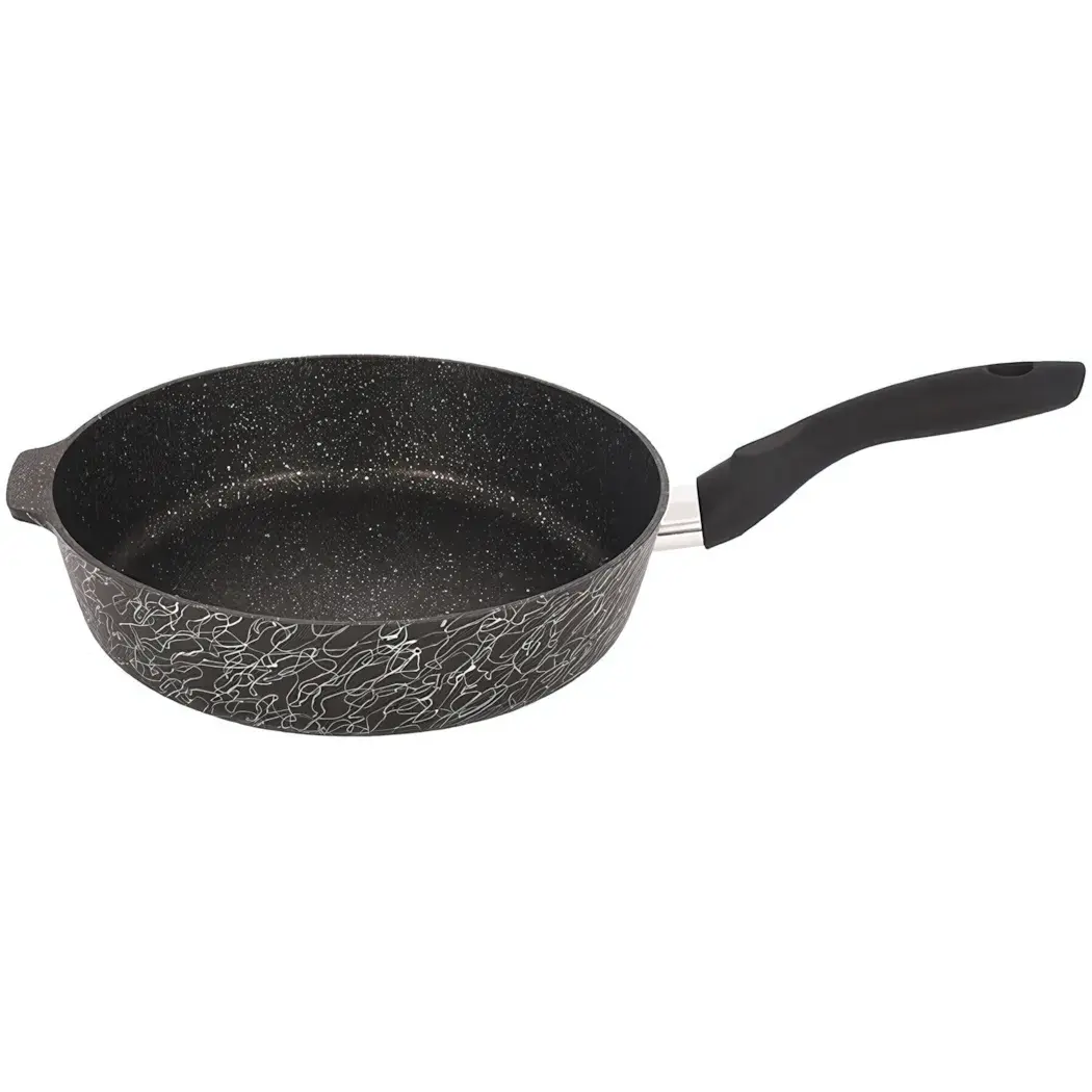 Сковорода выполнена из литого алюминия, что обеспечивает легкость и долговечность. Ее размеры составляют 28 см в диаметре, что делает ее идеальной для приготовления различных блюд. Черный цвет с белым абстрактным узором придает ей современный вид, а удобная ручка делает использование сковороды комфортным.