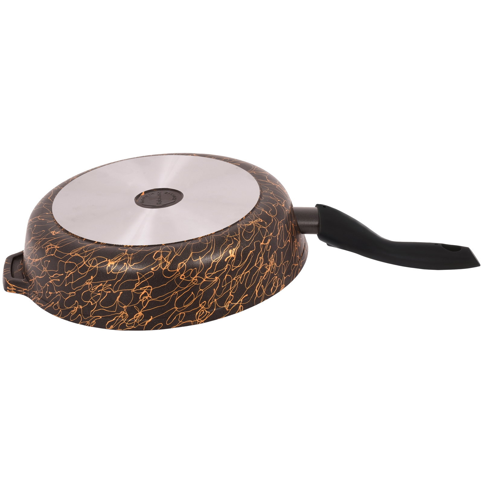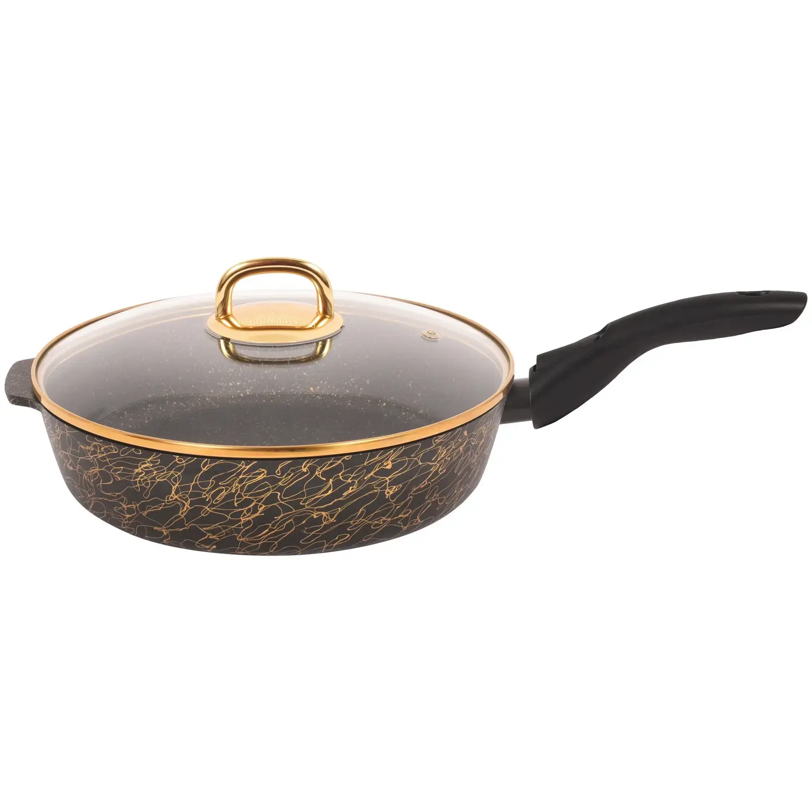 Сковорода изготовлена из литого алюминия, что обеспечивает равномерное распределение тепла и долговечность. Диаметр сковороды составляет 28 см, что делает её идеальной для приготовления блюд на небольших и средних порциях. Черный цвет с золотым узором добавляет стильный акцент, а стеклянная крышка с золотистой окантовкой завершает образ.