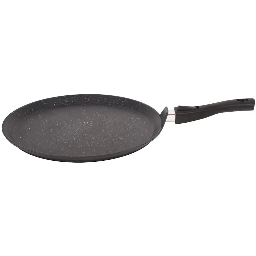 Сковорода имеет черный цвет с мелкими белыми вкраплениями, что придает ей стильный вид. Длинная ручка из пластика обеспечивает удобство при использовании и хранении. Сковорода-лавашница станет отличным дополнением к вашей кухонной утвари и поможет вам готовить любимые блюда с легкостью и удовольствием.
