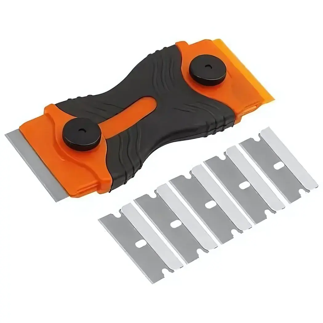 В комплект входит 5 сменных лезвий, что позволяет вам всегда иметь под рукой запасные элементы. Размеры скребка не указаны, но он удобно лежит в руке и подходит для большинства задач по очистке. Этот скребок станет незаменимым помощником в вашем доме!
