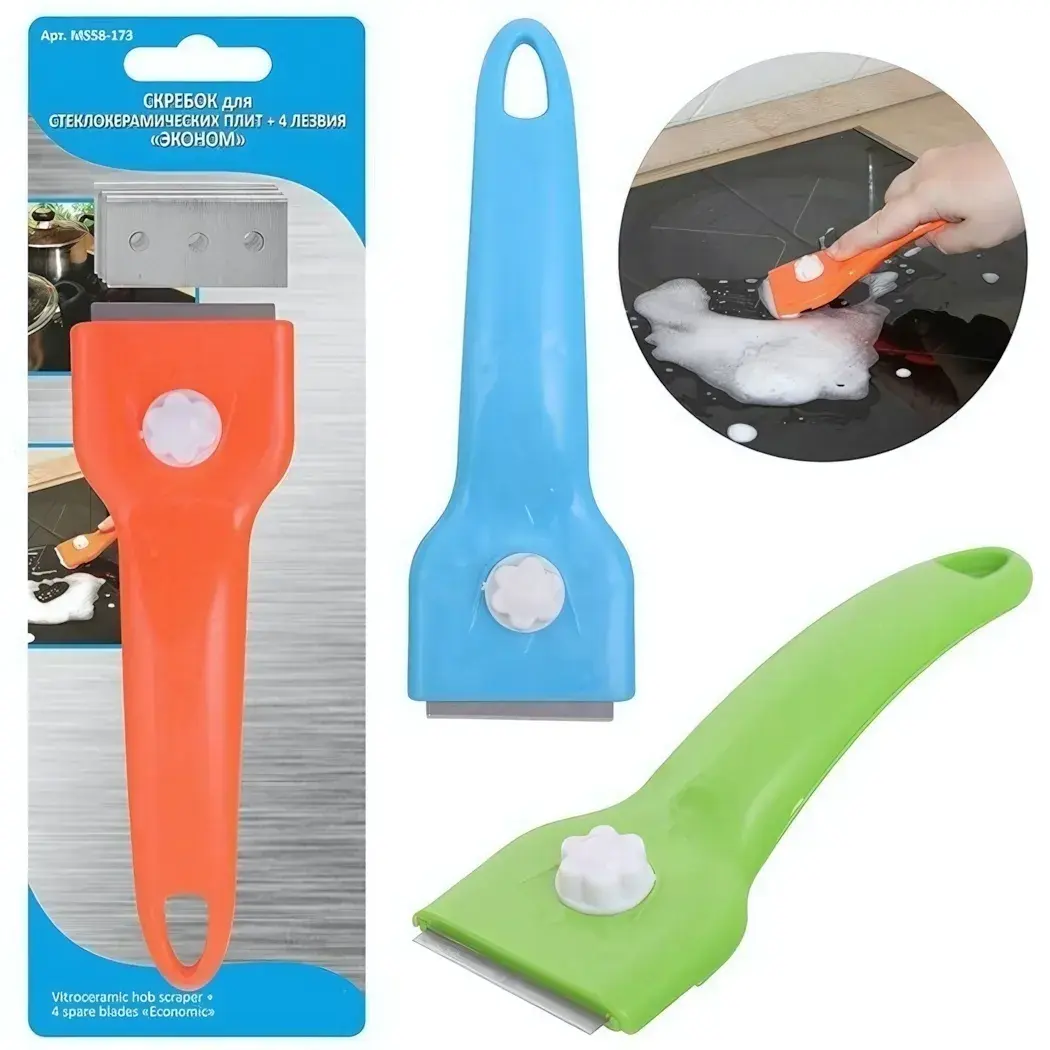 Скребок для стеклокерамической плиты — это ваш надежный помощник в уходе за кухонной техникой. Он обеспечивает легкость и комфорт в процессе уборки, позволяя вам быстро и эффективно очищать поверхность плиты от загрязнений. Благодаря специальному дизайну и качественным материалам, этот инструмент значительно продлевает срок службы вашей плиты и сохраняет её презентабельный вид.