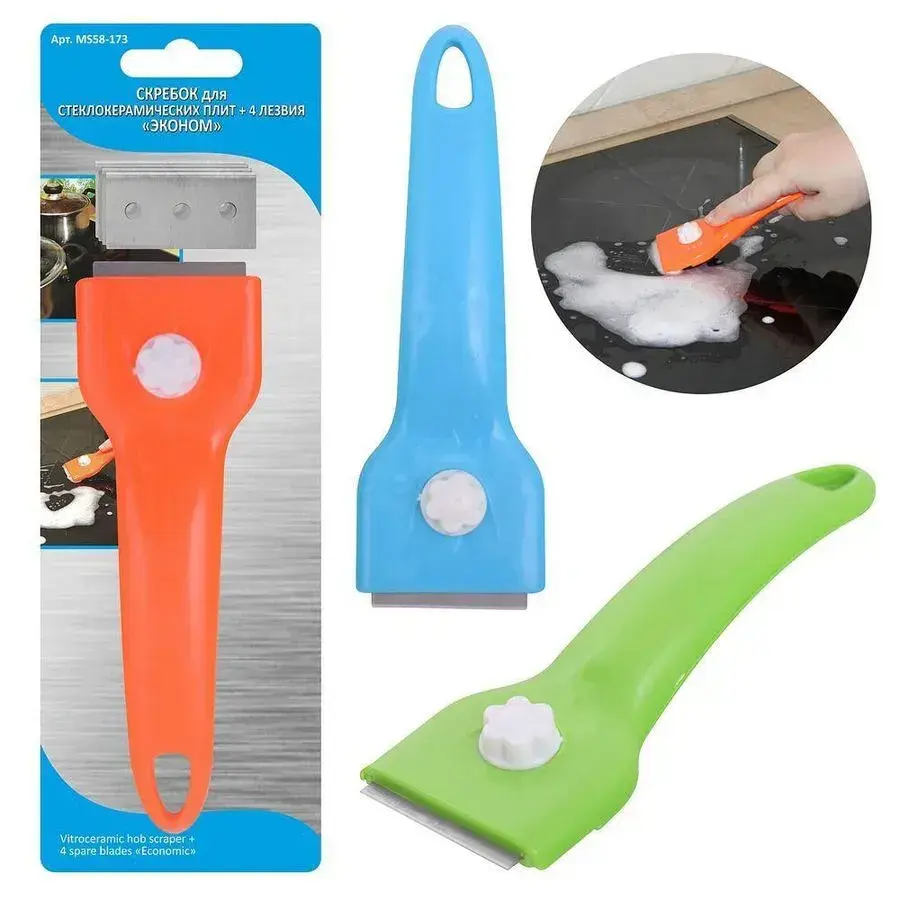 Скребок для стеклокерамических плит 'ЭКОНОМ' — ваш незаменимый помощник на кухне. Эффективно удаляет загрязнения, не повреждая поверхность, и экономит ваши силы благодаря надежным сменным лезвиям.
