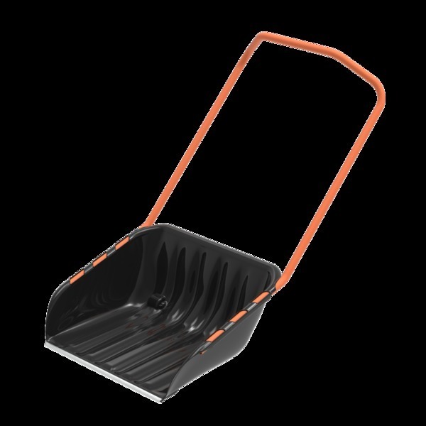 Скрепер выполнен в черном цвете с оранжевыми деталями, что делает его не только функциональным, но и стильным. Длина ручки позволяет использовать его стоя, что снижает нагрузку на спину. Текстурированное дно улучшает эффективность при сборе снега, что делает уборку еще более быстрой и легкой.