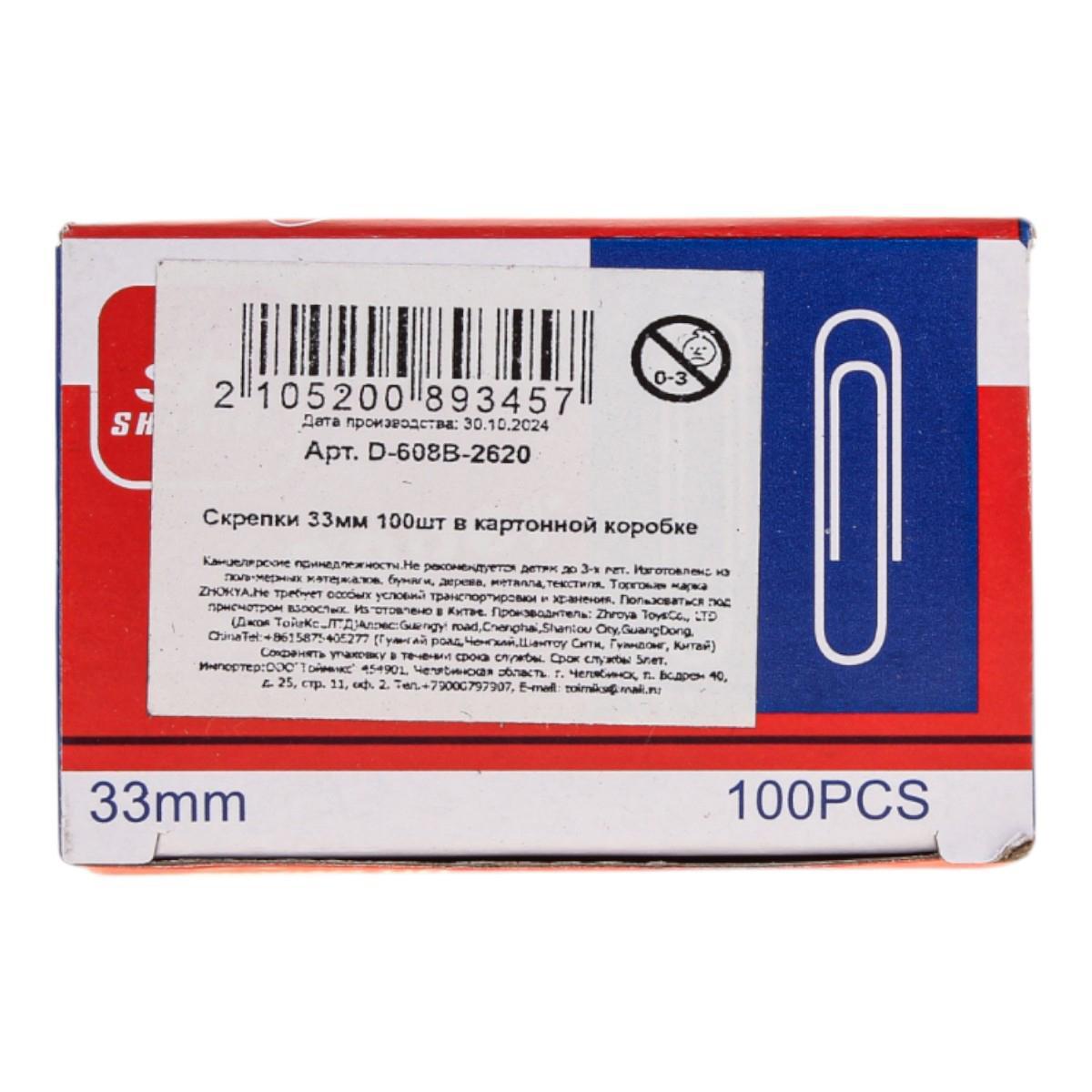 Скрепки металлические 33мм, 100шт в картонной коробке, антикоррозийное покрытие