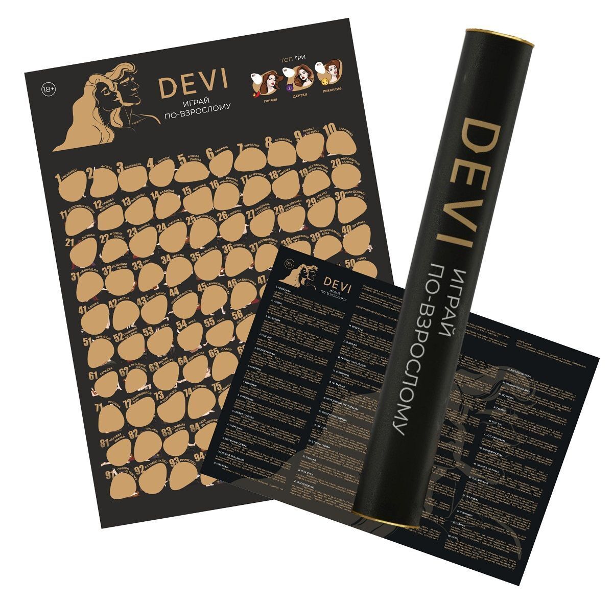 Скретч-плакат Devi — это изысканный способ разнообразить ваши отношения. 100 оригинальных поз под золотистым слоем превратят обычный вечер в захватывающий квест для двоих.