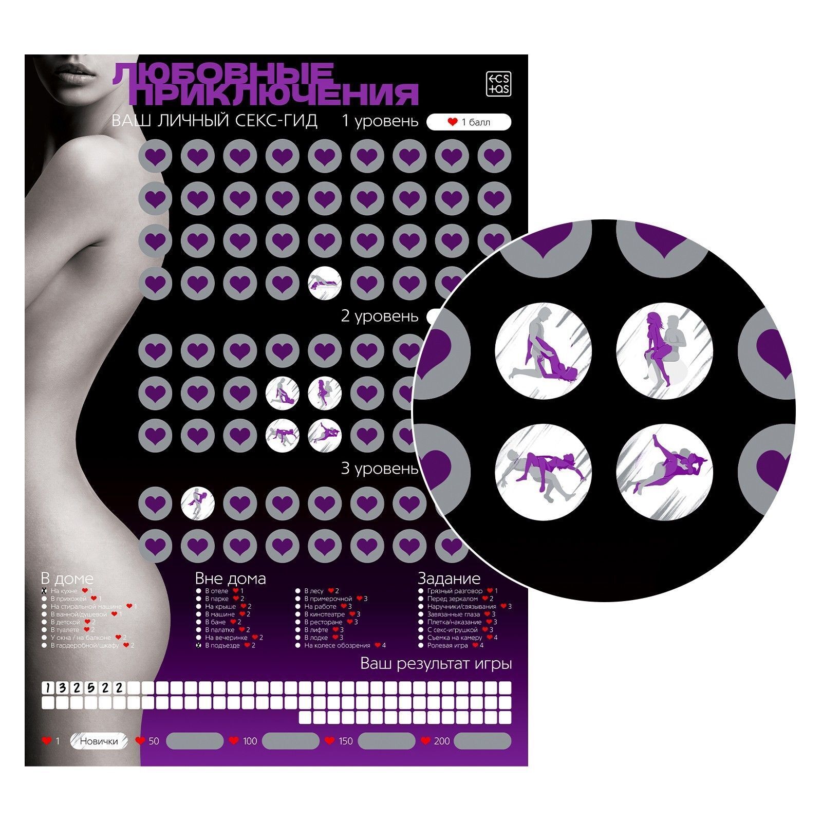 Игра подходит для пар, которые хотят добавить в свою жизнь немного остроты и новизны. Просто выберите задание, выполните его и закрасьте соответствующий участок на плакате. Это не только увлекательно, но и позволяет отслеживать ваши достижения и прогресс в интимной сфере.