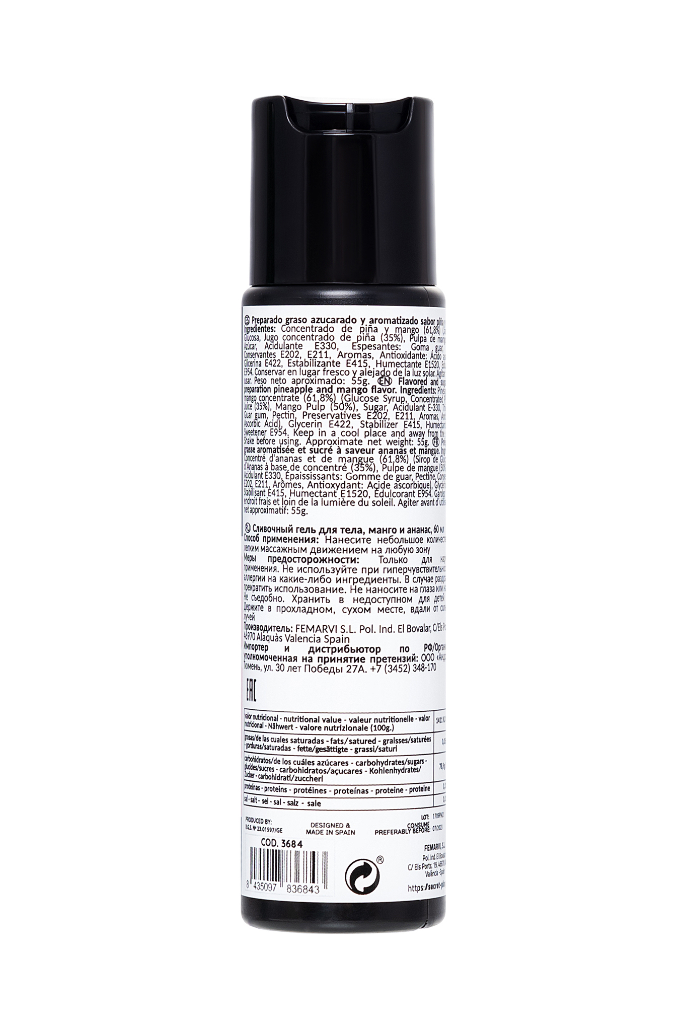 Объем флакона составляет 55 грамм, что делает его удобным для хранения и использования. Упаковка оформлена в ярком дизайне с изображениями манго и ананаса, что подчеркивает тропическую тематику продукта. Гель не содержит вибрации и подходит для всех, кто хочет добавить немного сладости в свою интимную жизнь.