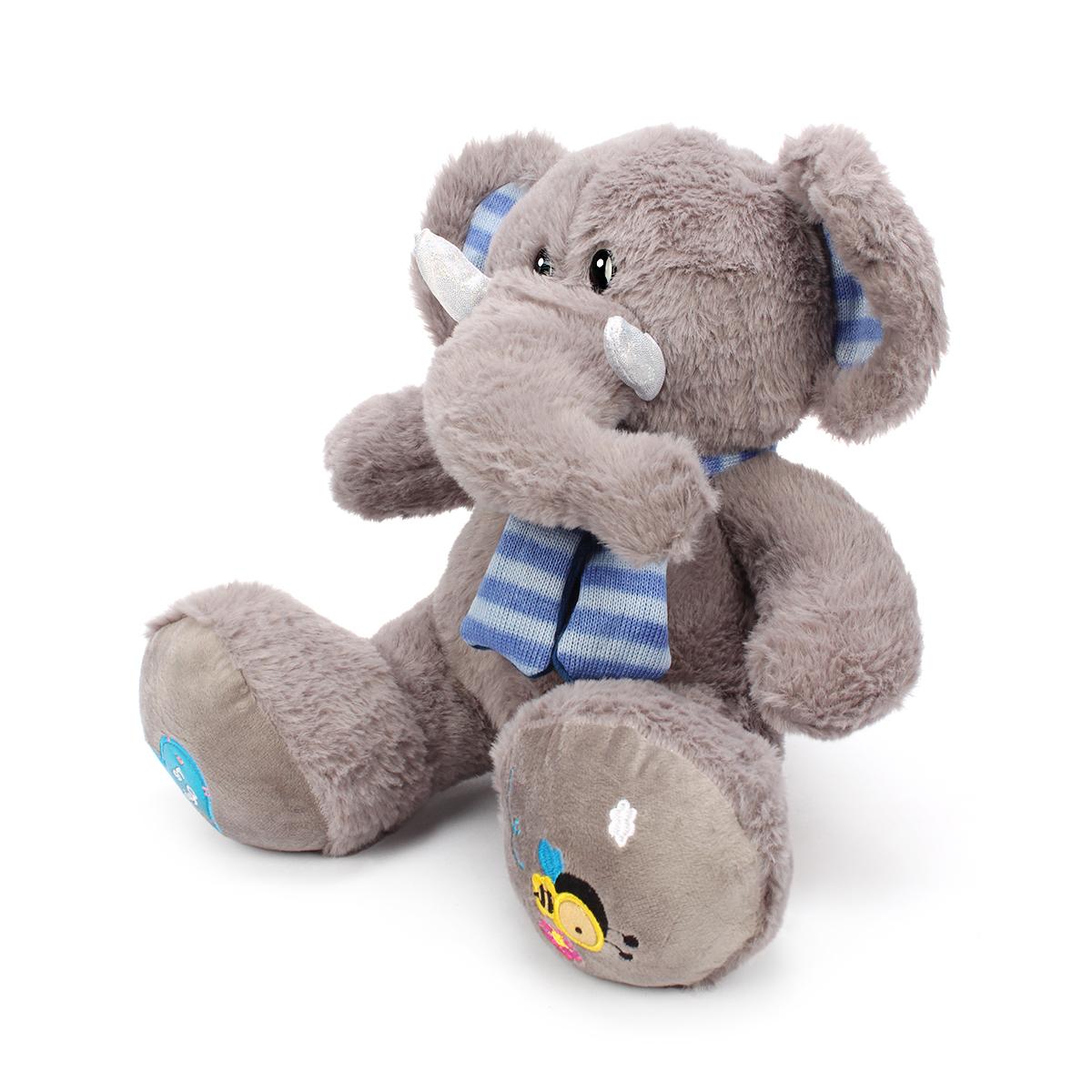 Размер игрушки составляет 26x33x24 см, что делает её идеальной для обнимания. Серый цвет с контрастными голубыми вставками в ушах и сине-белым бантиком на шее придаёт игрушке привлекательный вид. У игрушки круглые черные глаза и серебристые элементы в форме бивней, что добавляет ей очарования. Ноги украшены вышивкой с изображением пчелы и цветка, что делает её ещё более уникальной.