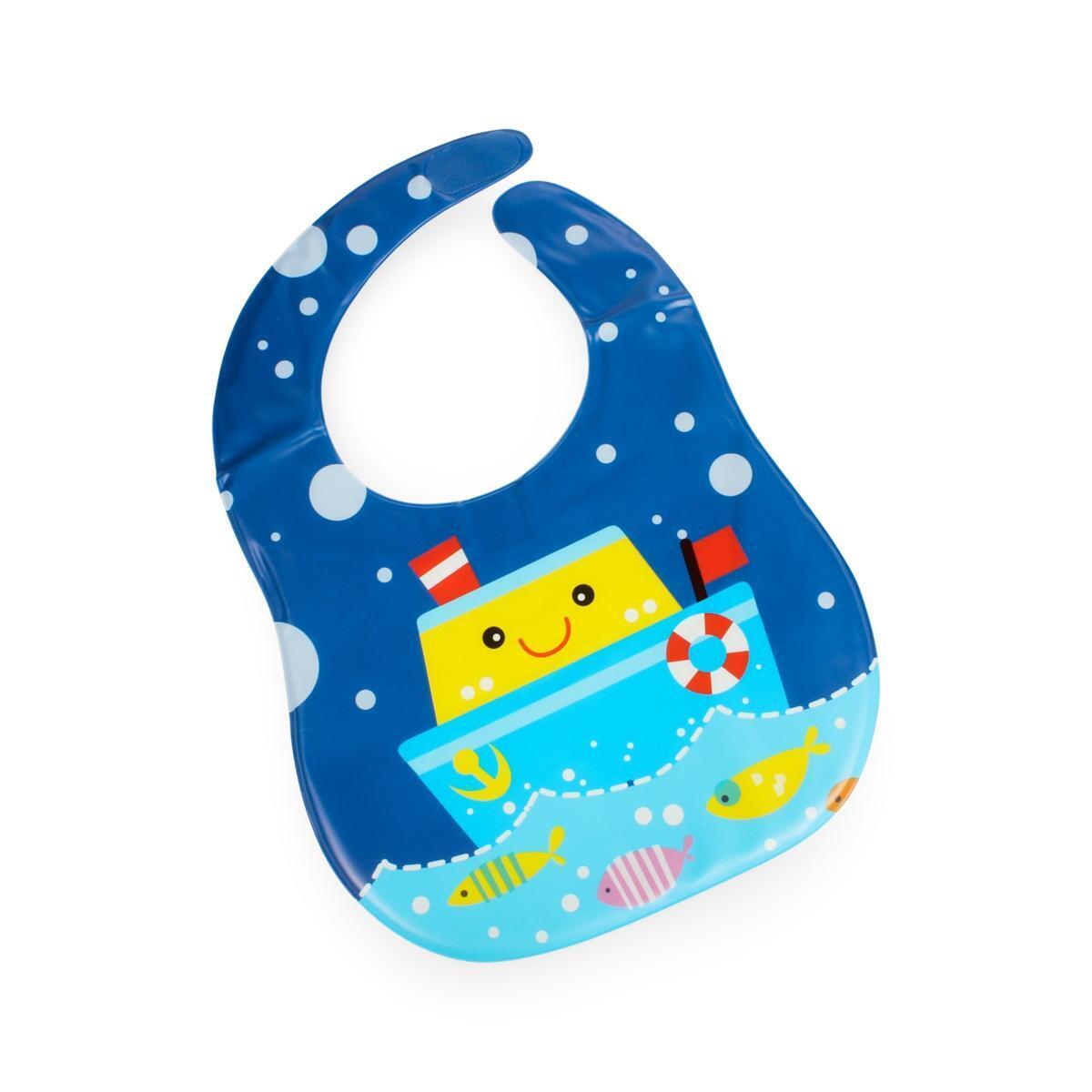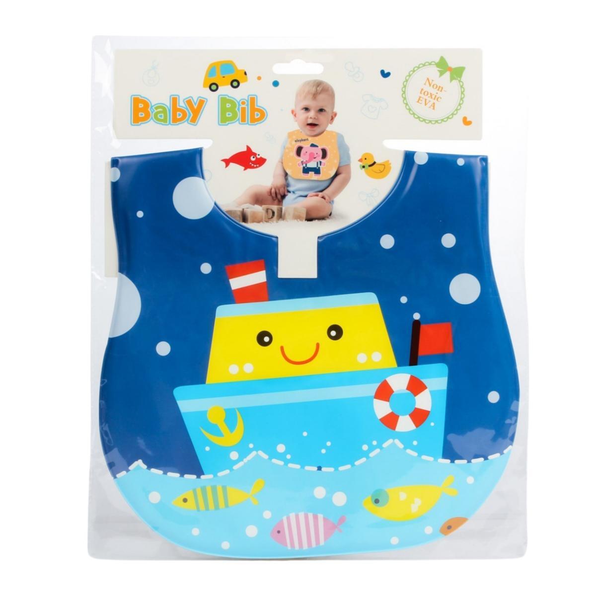 Изделие выполнено в яркой цветовой гамме с рисунком в морской тематике — улыбающимся кораблем и рыбками, что привлекает внимание малыша и способствует развитию его интереса к окружающему миру. Наличие кнопок-застежек обеспечивает надежную фиксацию и удобство в использовании.