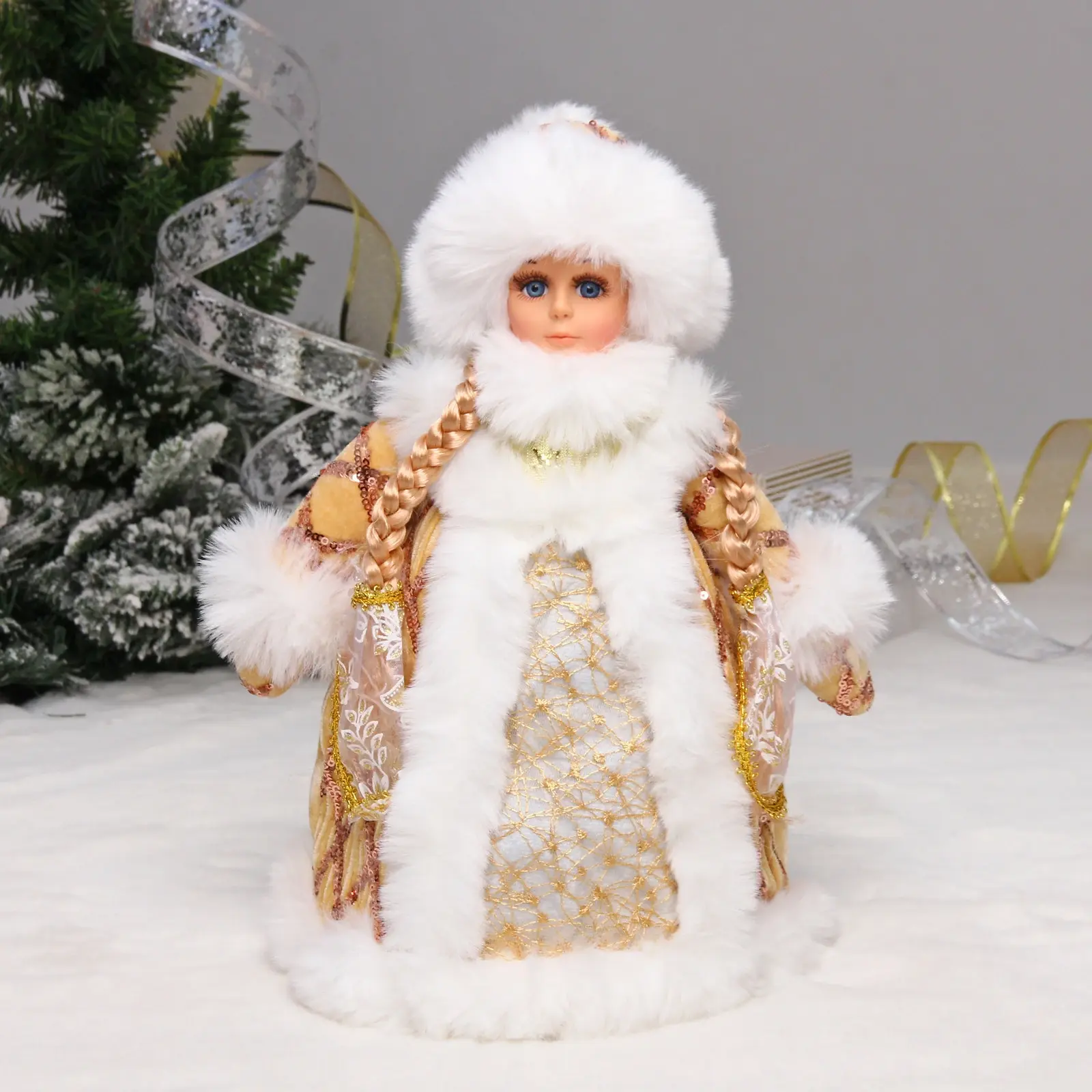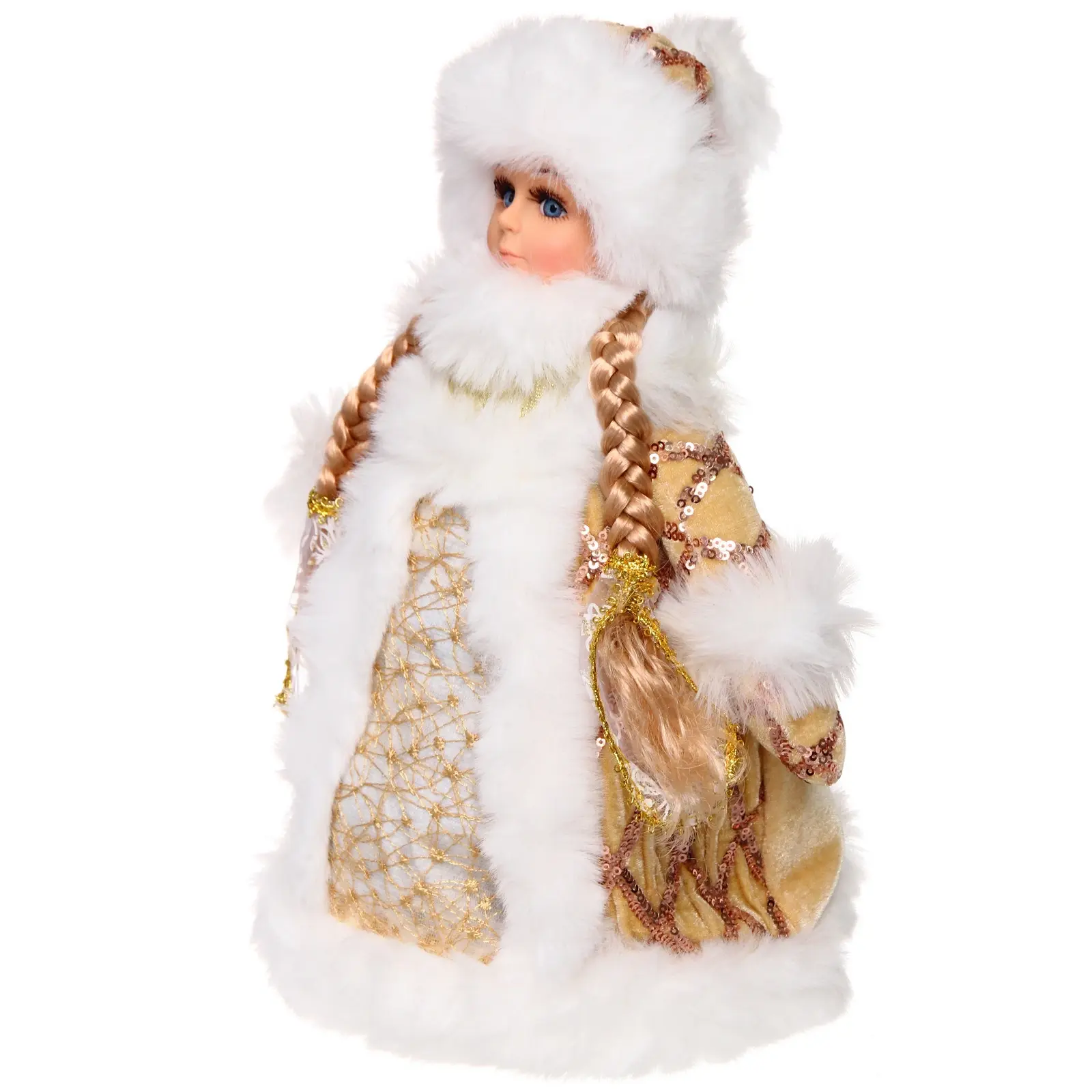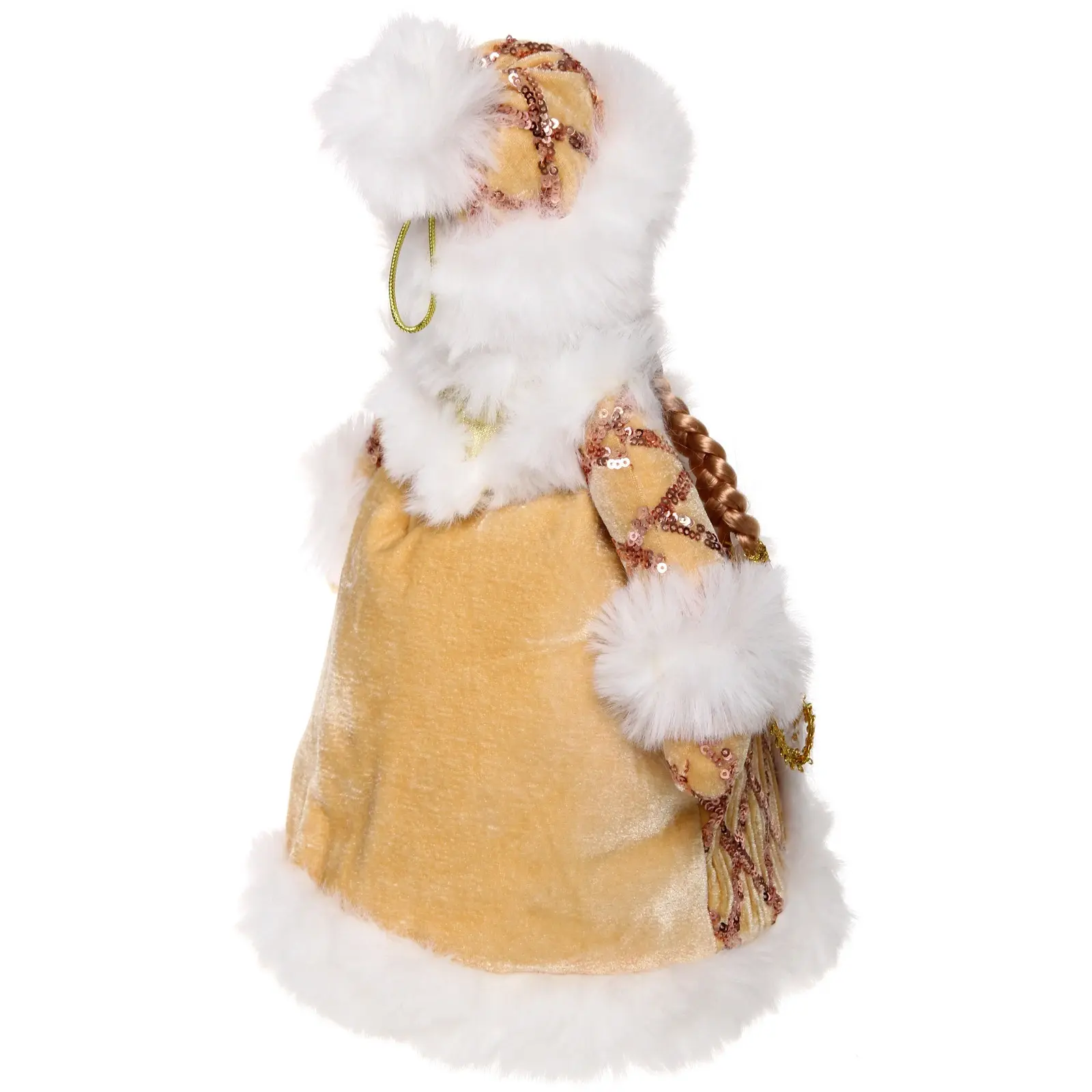 Фигурка выполнена из текстиля и пластика, что обеспечивает лёгкость и долговечность. Оттенки золотого цвета, белого меха и декоративных элементов гармонично сочетаются и создают праздничное настроение. Снегурочка отгружается поштучно.