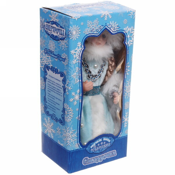 Эта кукла выделяется своим качественным исполнением и вниманием к деталям. Платье светло-голубого цвета с белым мехом и декоративными элементами, такими как пайетки и ленты, придает ей особый шарм. Длинные волосы, заплетенные в косу, и меховая шапка делают образ завершенным и стильным. Снегурочка выполнена из текстиля и пластика, что обеспечивает долговечность и легкость в уходе.