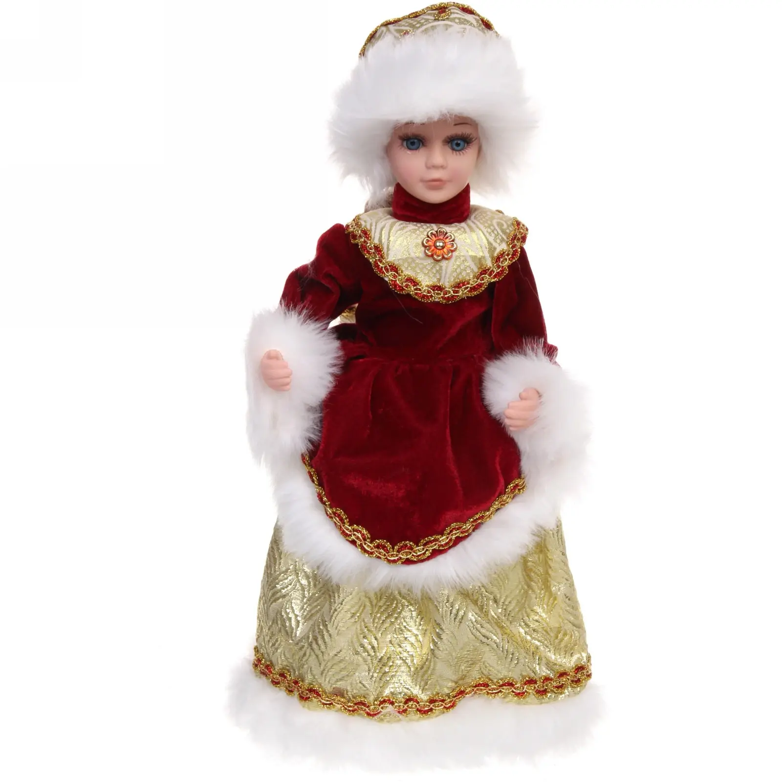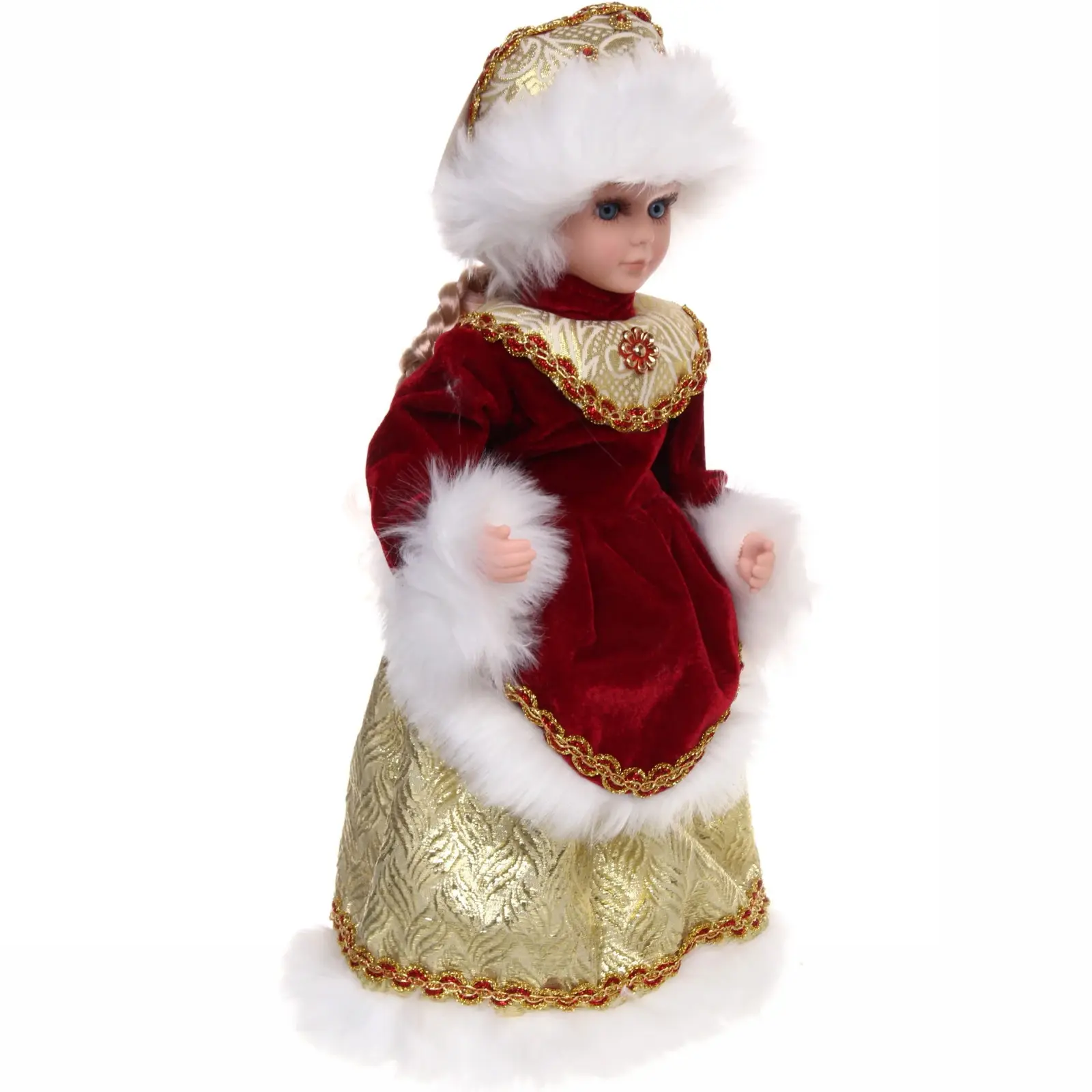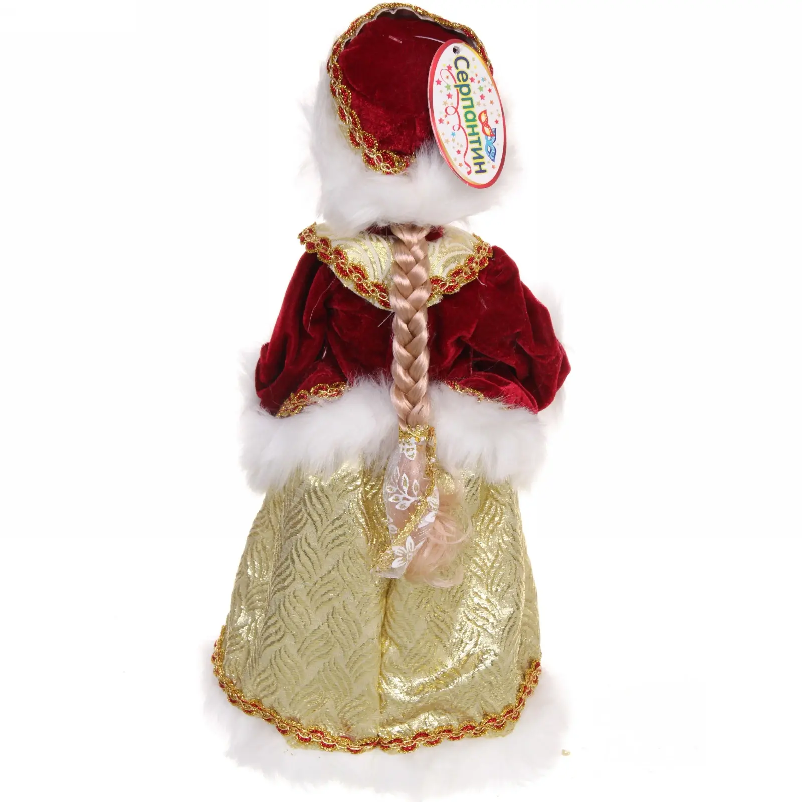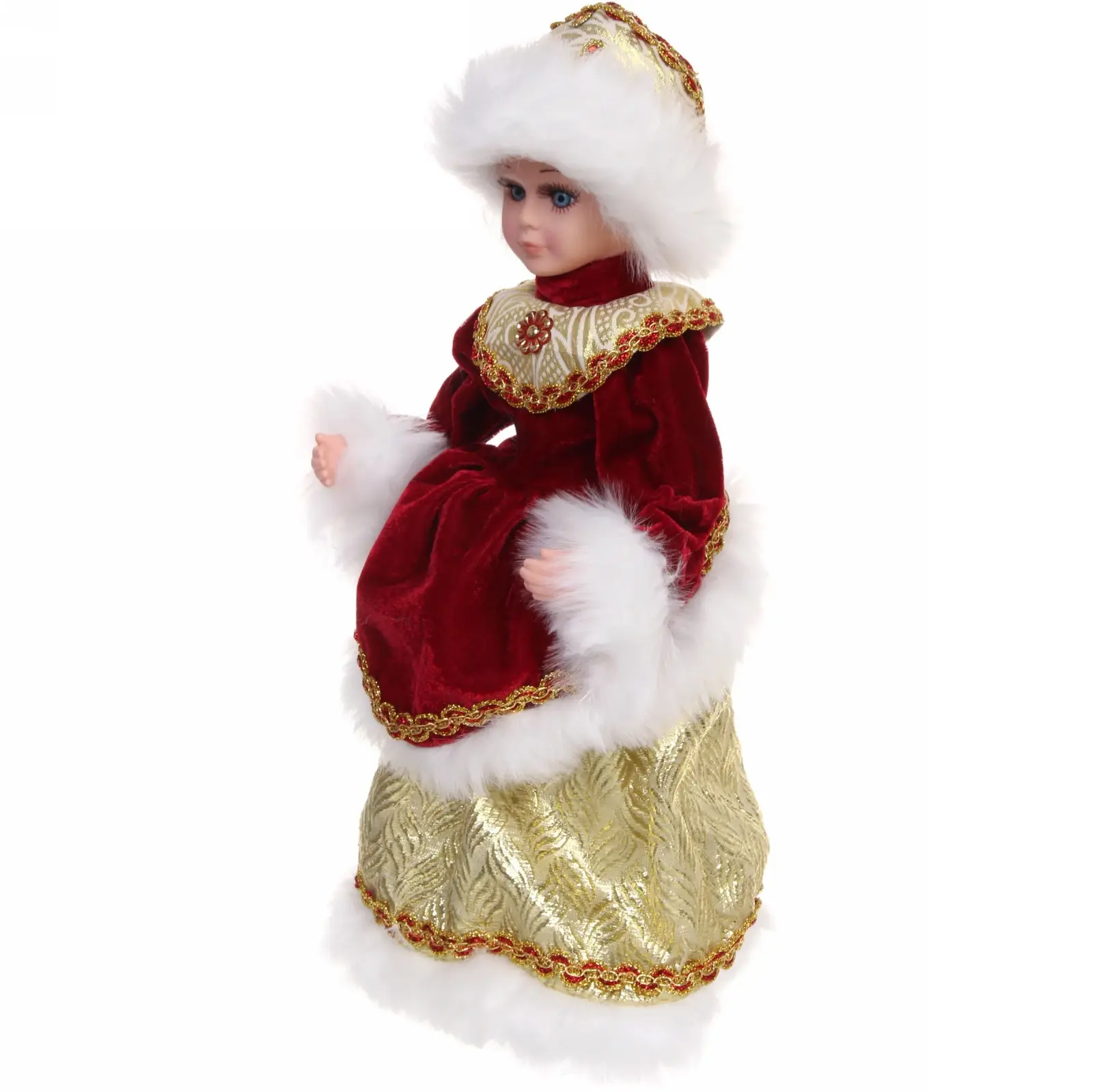 Снегурочка изготовлена из высококачественных материалов: пластика и текстиля, что обеспечивает ей долговечность. Размеры куклы — 40 см, что делает ее удобной для размещения на полке или столе. Праздничный наряд включает рубиновую шубу с золотыми элементами, что делает ее особенно привлекательной в новогодний период.