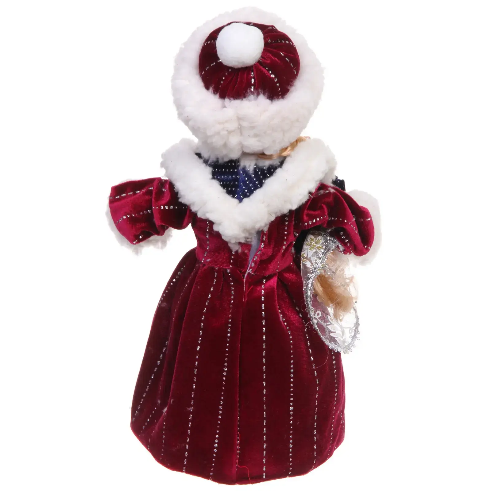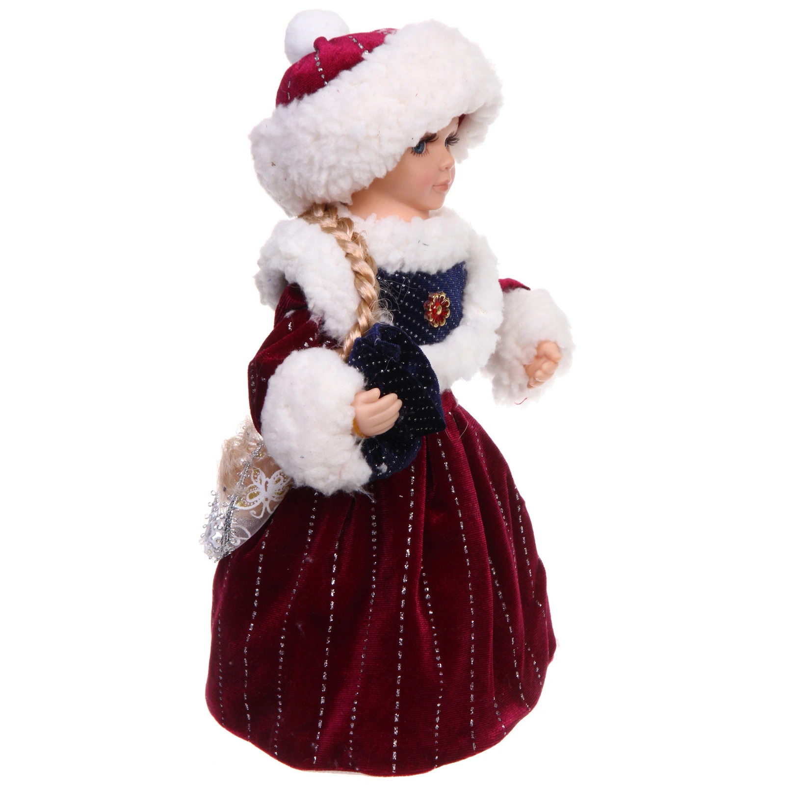 Снегурочка имеет размеры 30 см, что делает ее удобной для размещения на полке или в качестве настольного декора. Бордовая шубка и яркие детали платья привлекают внимание и создают праздничное настроение. Не упустите возможность добавить эту замечательную куклу в свою коллекцию новогодних украшений!