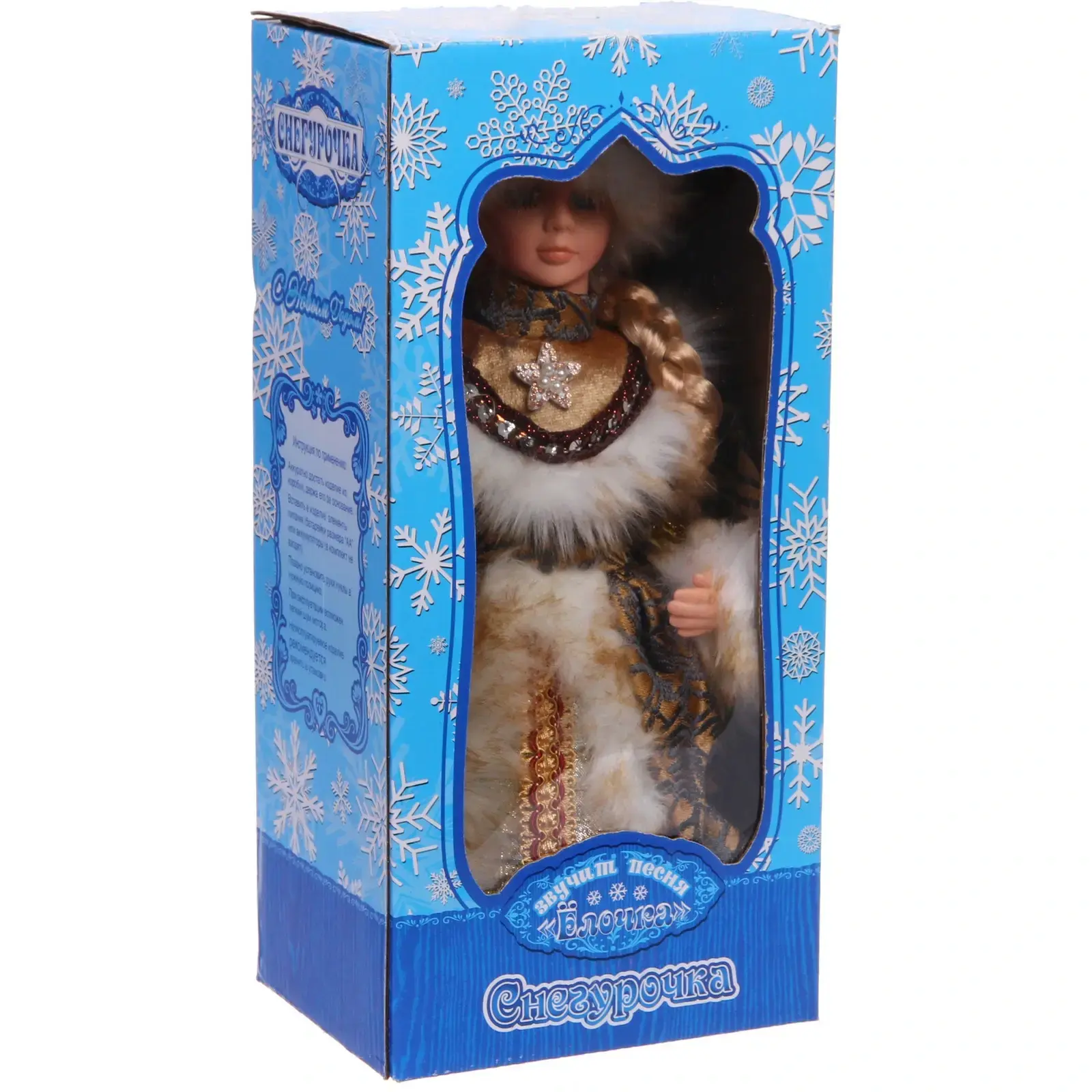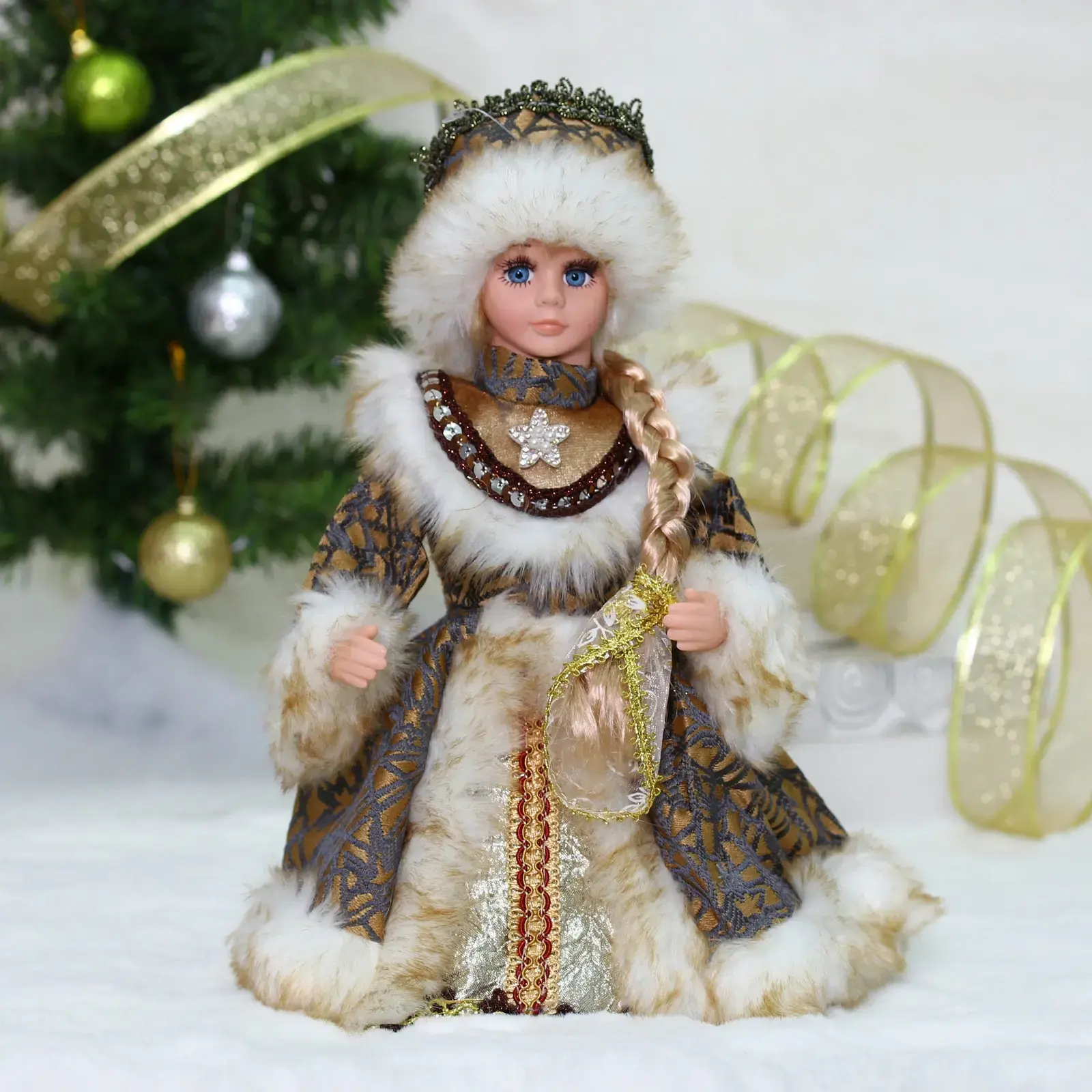 Музыкальная Снегурочка 'Волшебный день' станет сердцем вашего новогоднего декора. Её нарядное платье с золотистыми узорами и меховой отделкой создаст атмосферу праздника.