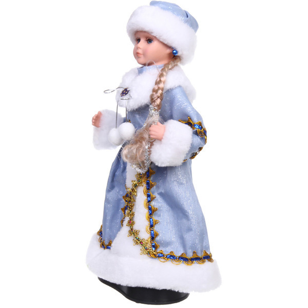 Снегурочка «Волшебный праздник» высотой 40 см станет ярким акцентом вашего новогоднего декора. Эта кукла в голубой шубке с белыми меховыми элементами и золотыми украшениями создаст атмосферу волшебства и уюта в вашем доме. Ее выразительные голубые глаза и длинные светлые волосы, заплетенные в косу, придают ей особый шарм и привлекательность.
