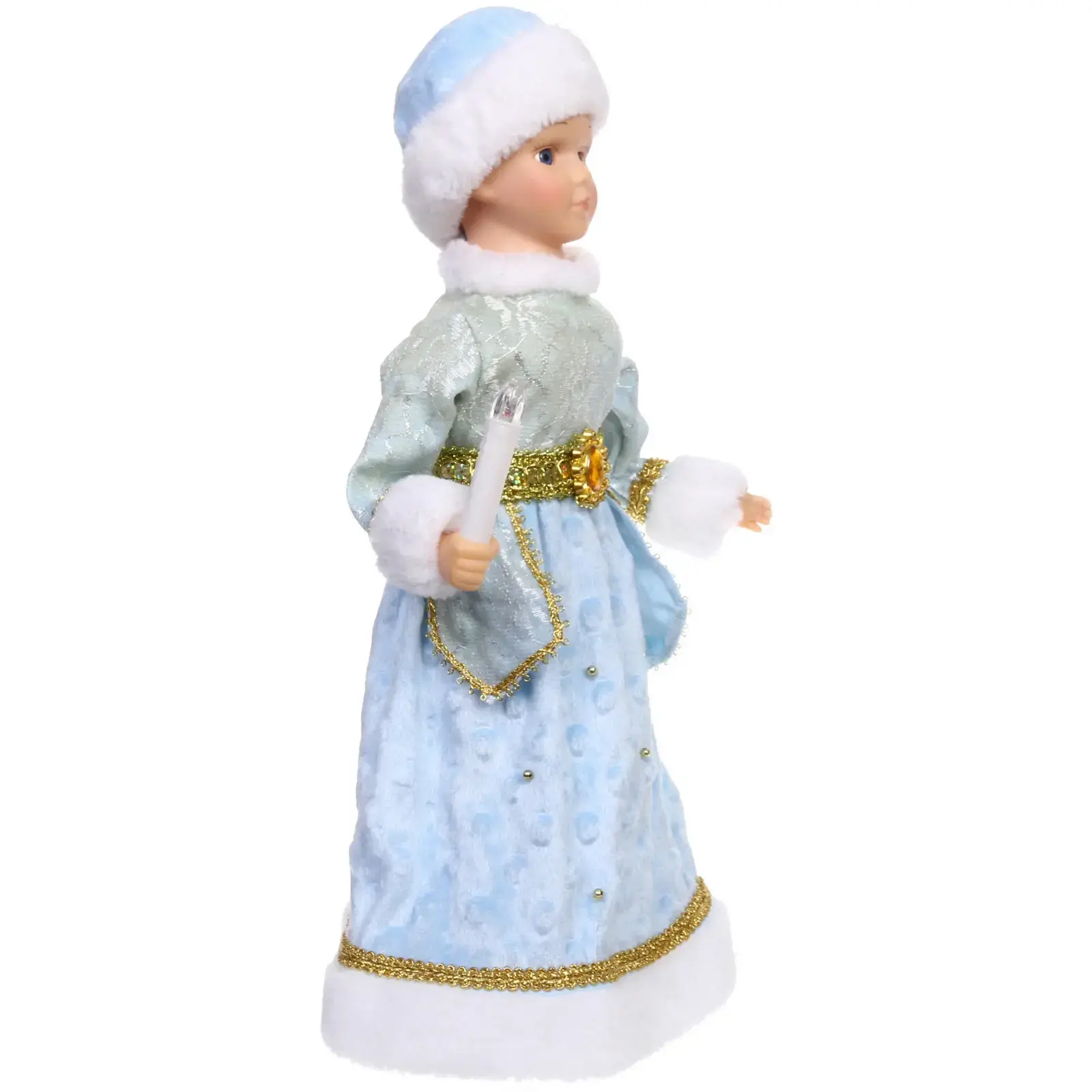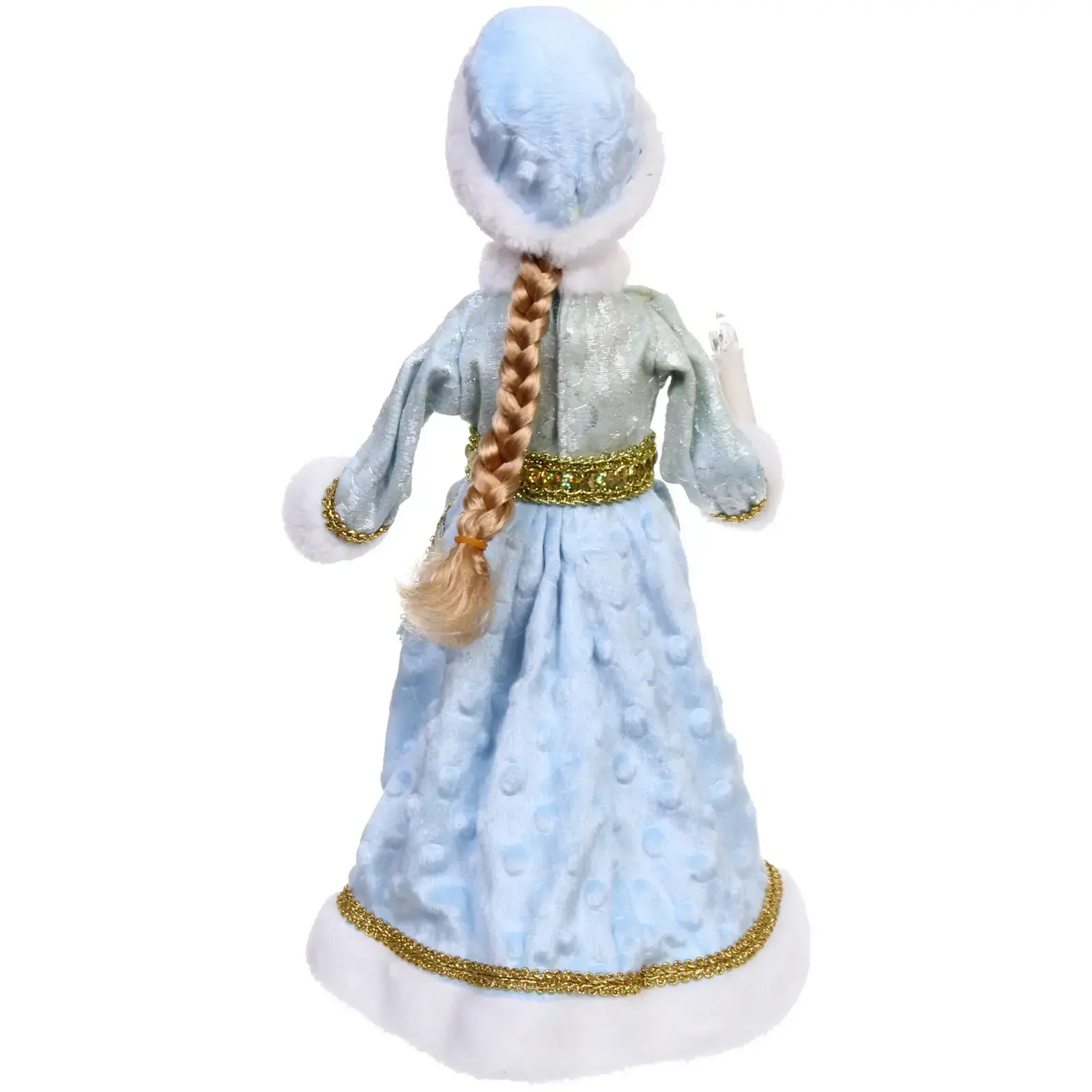 Кукла имеет высоту 40 см и выполнена в светло-голубом цвете, что делает её универсальным элементом декора. Платье украшено золотыми элементами и белым мехом, а также имеет текстурные детали, которые придают ей уникальность. Снегурочка держит в руках прозрачную палочку, что добавляет ей волшебного шарма.