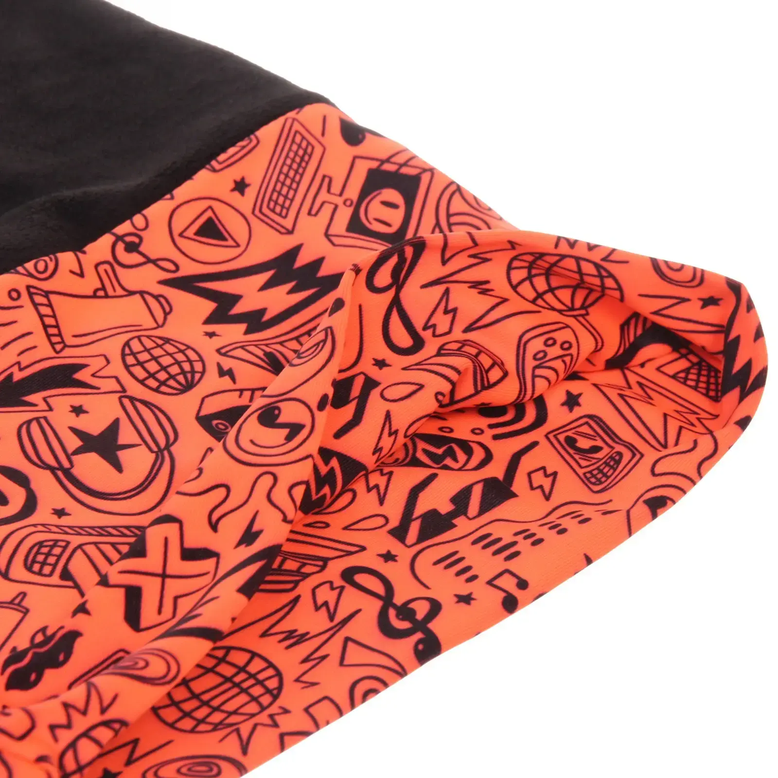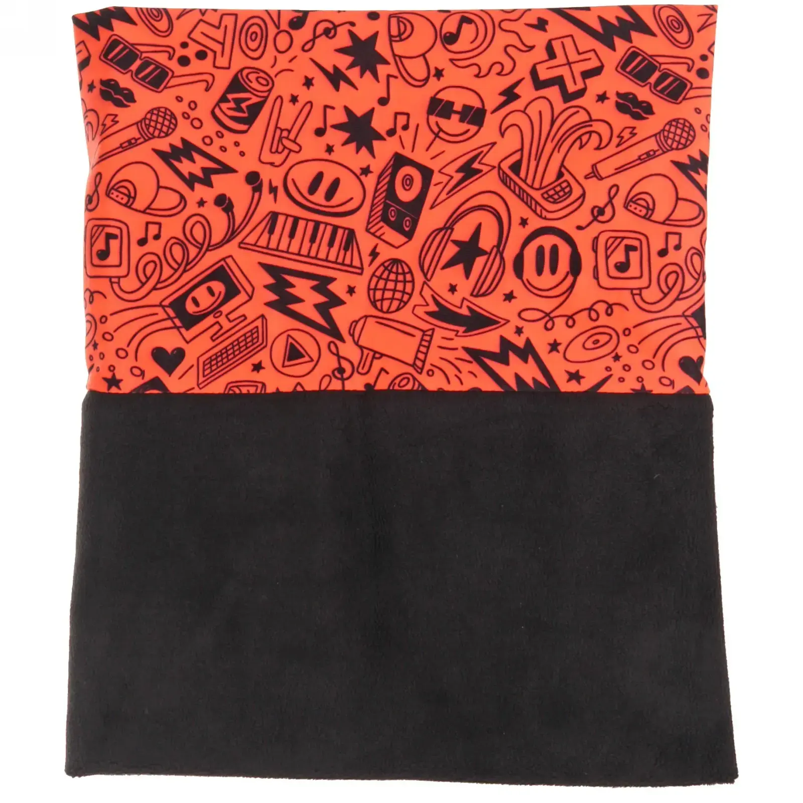 Верхняя часть выполнена в ярко-оранжевом цвете с графическими элементами музыкальной тематики, нижняя — из черного полиэстера с мягкой текстурой. Контрастное сочетание позволяет комбинировать аксессуар с разной одеждой.