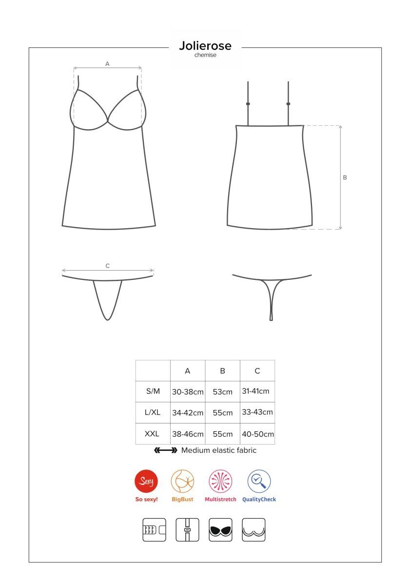 Выбирая сорочку Jolierose, вы получаете не только стильный элемент гардероба, но и практичное решение для создания сексуального образа. Мягкий лиф на косточках поддерживает грудь, а кружевная отделка добавляет нотку игривости. В комплекте идут трусики-стринги, что делает этот набор идеальным для романтических моментов.