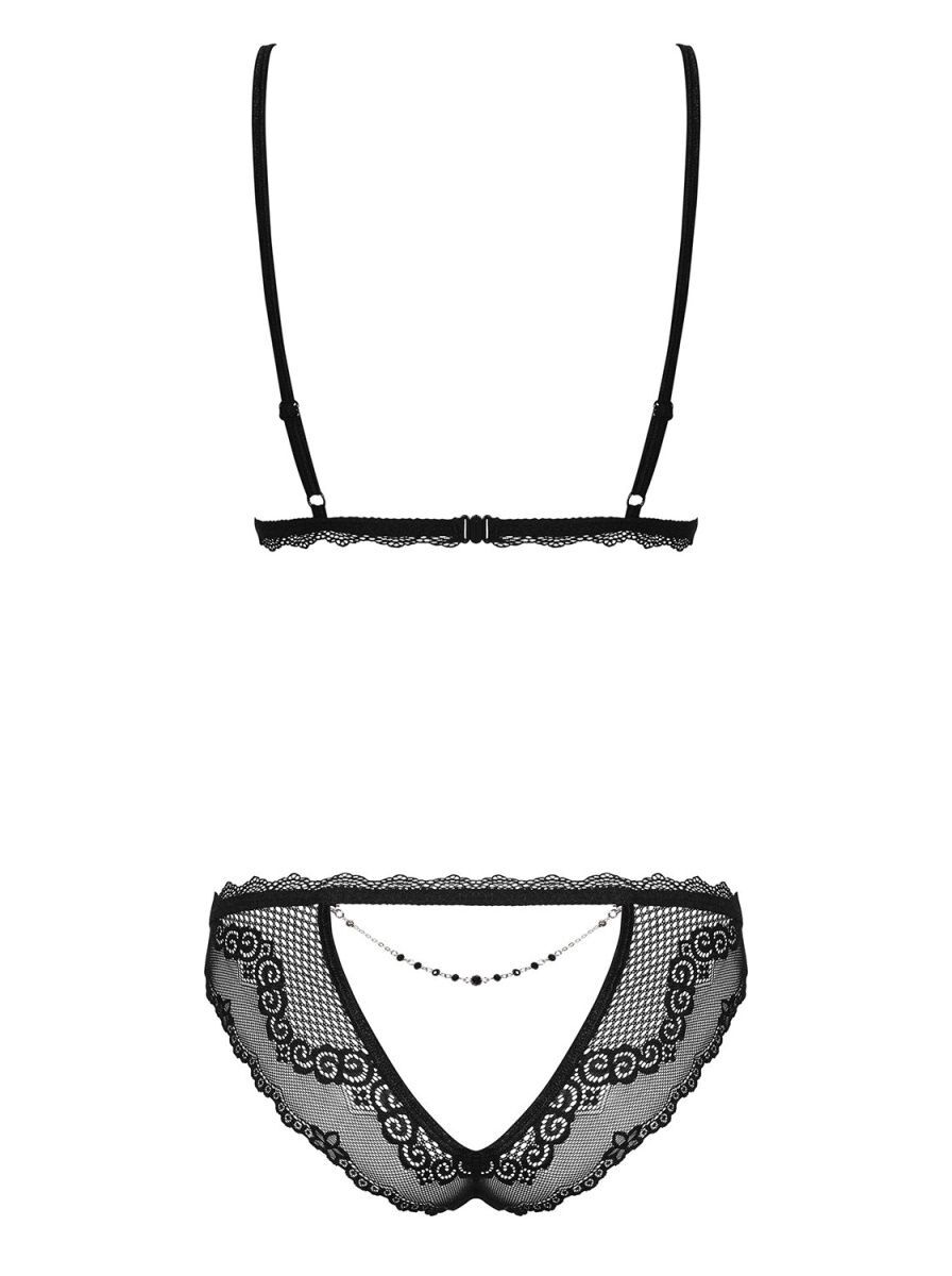 Комплект включает в себя бюстгальтер и трусики-стринги, которые идеально подойдут для женщин размером L-XL. Бюстгальтер без косточек с разрезами и регулируемыми бретелями обеспечивает отличную поддержку и комфорт. Трусики с вырезом на ягодицах и декоративной цепочкой добавляют пикантности и сексуальности вашему образу.