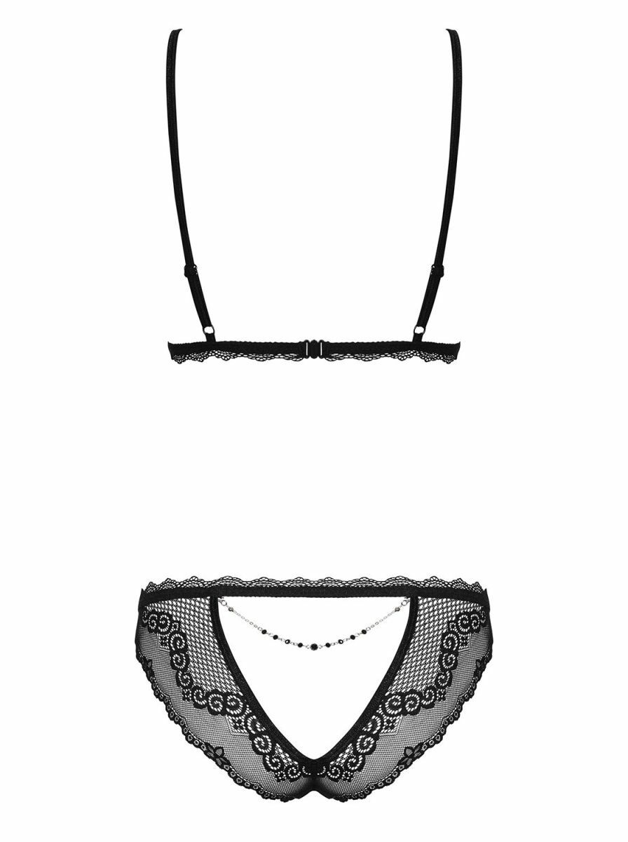 Комплект состоит из мягкого лифа без косточек и трусиков-стрингов, которые подчеркивают вашу фигуру. Лиф имеет регулируемые бретели и удобную застежку на спинке, что позволяет легко подогнать его под ваши размеры. Трусики с вырезом на ягодицах и спереди, украшенные цепочкой, добавляют нотку игривости и сексуальности.