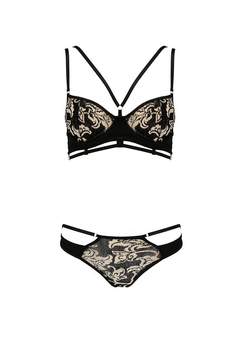 Комплект состоит из двух предметов: бюстгальтера и трусов. Бюстгальтер выполнен с декоративными бретелями и чашками из сетки с золотистым узором. Трусы имеют аналогичный узор спереди и декоративные двойные бретели по бокам, что создает гармоничный и завершенный образ.