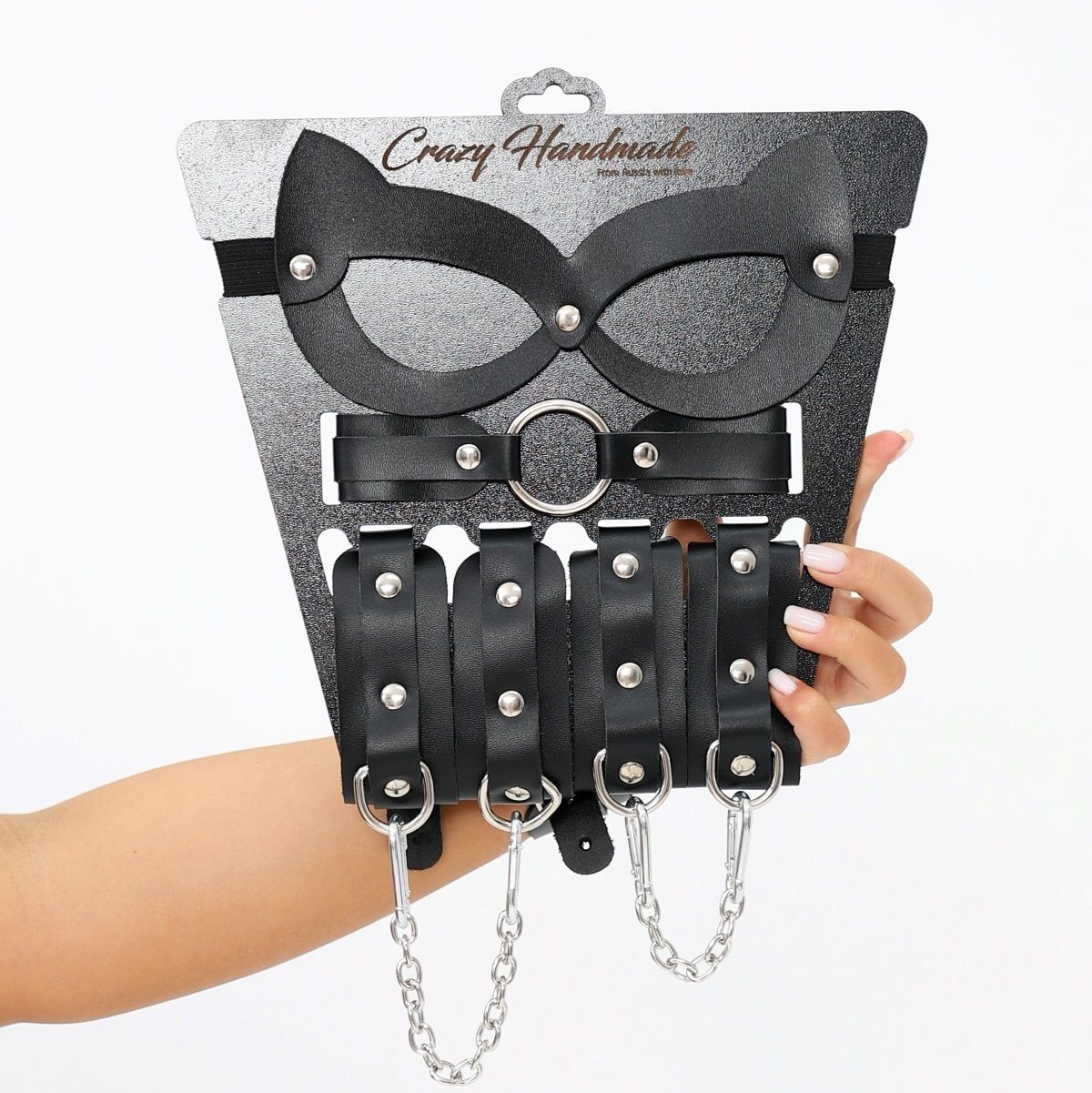 Набор для БДСМ «Crazy Handmade»: маска, чокер, наручники и оковы из натуральной кожи, черный цвет