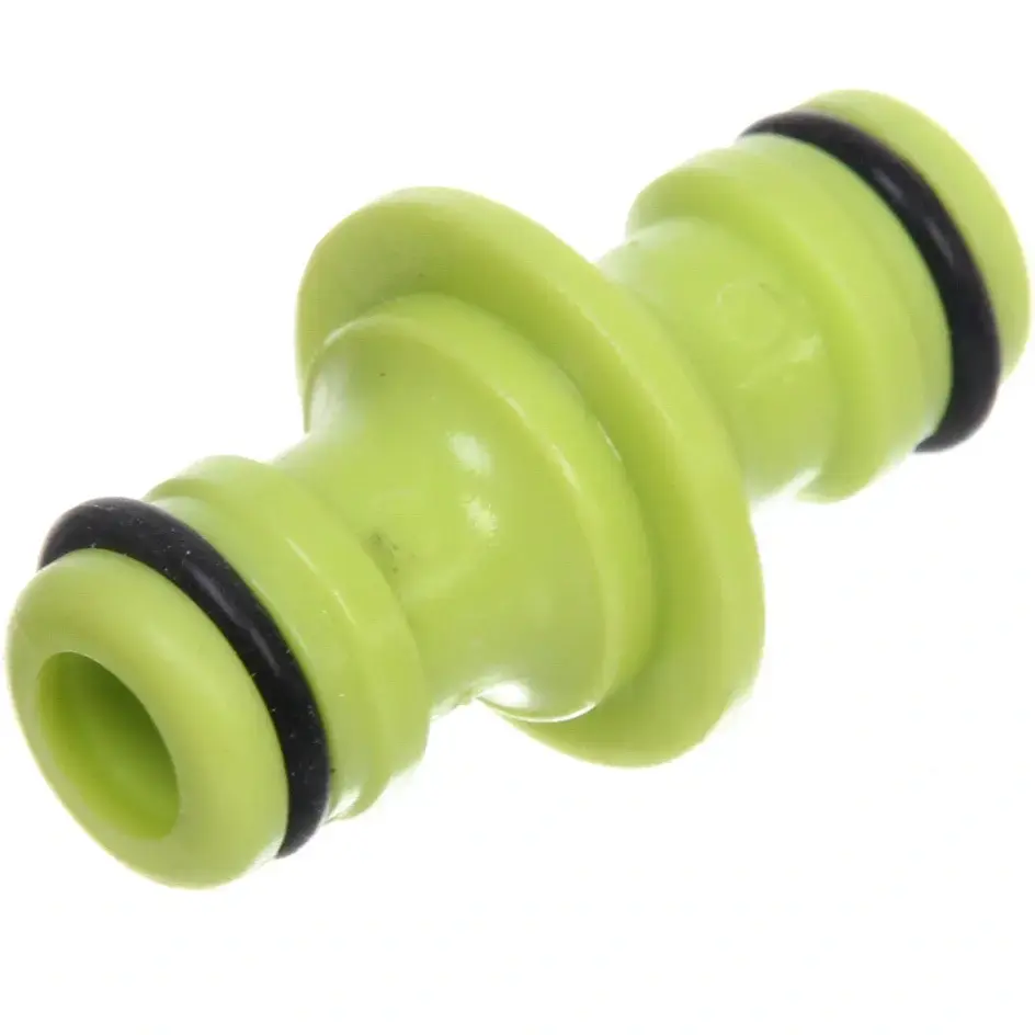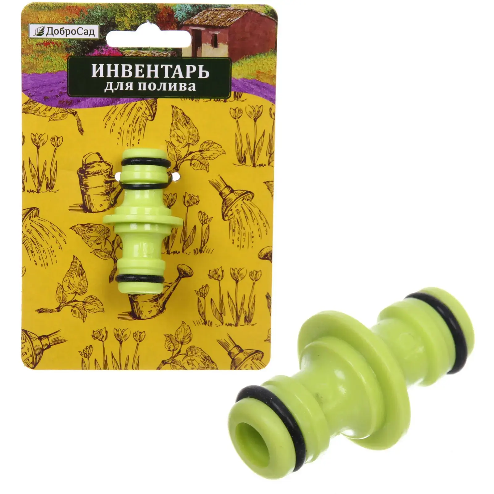 Соединитель имеет ярко-зеленый цвет и гладкую поверхность, что делает его не только функциональным, но и эстетически привлекательным. Он легко вписывается в любой садовый инвентарь. Размеры товара не указаны, но он выглядит компактным и удобным для установки.