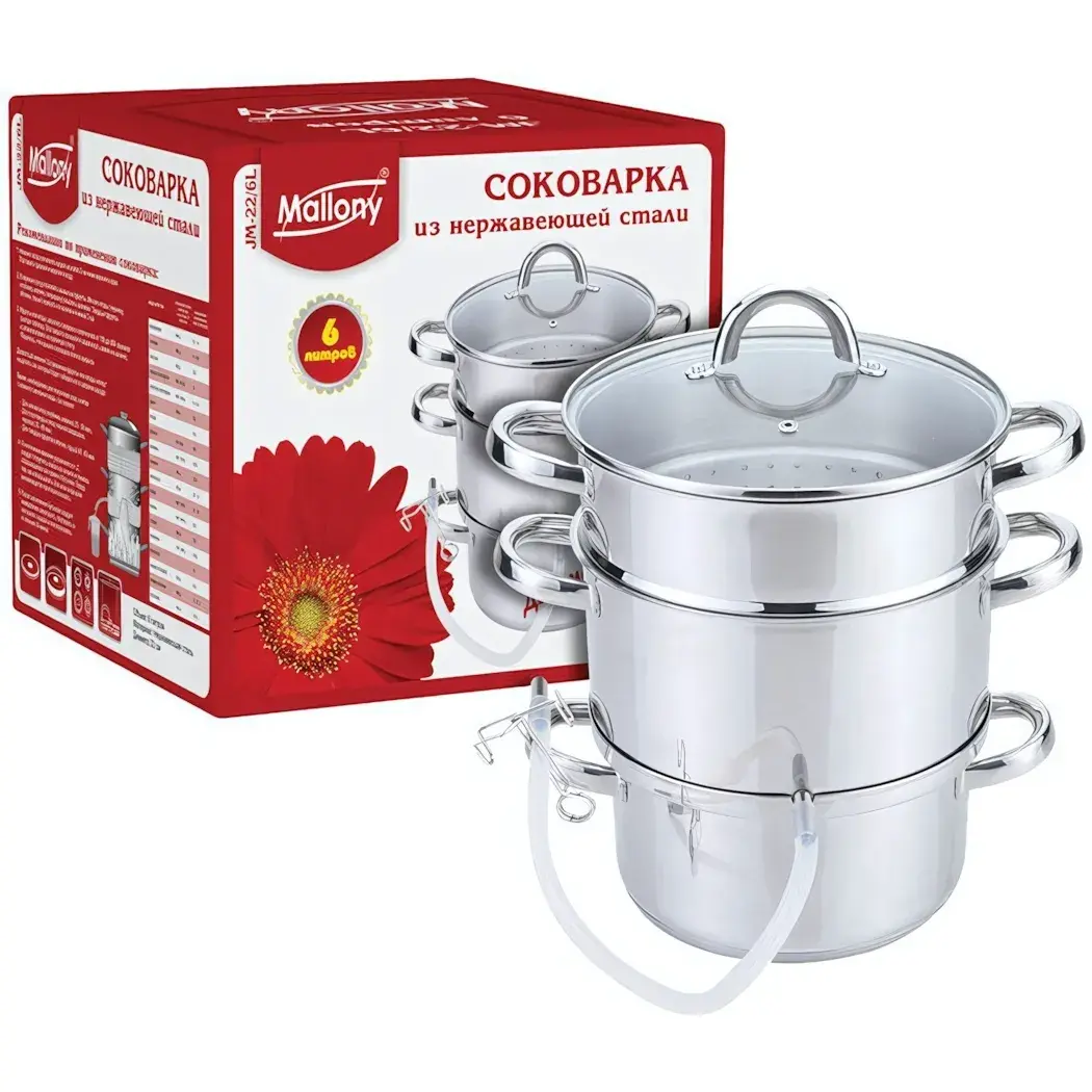 Соковарка имеет диаметр 22 см и объем 6 л, что позволяет готовить соки в больших количествах. Она выполнена из высококачественной нержавеющей стали, что гарантирует долговечность и легкость в уходе. Упаковка товара оформлена в ярком дизайне, что делает его отличным подарком для любителей домашнего приготовления соков.