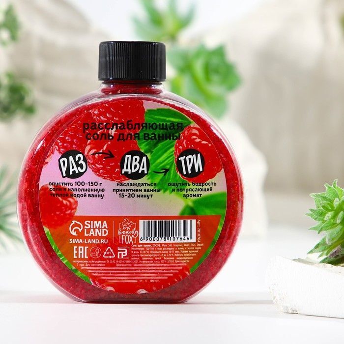 Объем упаковки составляет 350 г, что позволяет использовать соль несколько раз. Упаковка выполнена из качественного пластика и имеет удобную круглую форму с черной крышкой. Яркий красный цвет соли и изображение малины на упаковке создают привлекательный внешний вид, который украсит вашу ванную комнату.