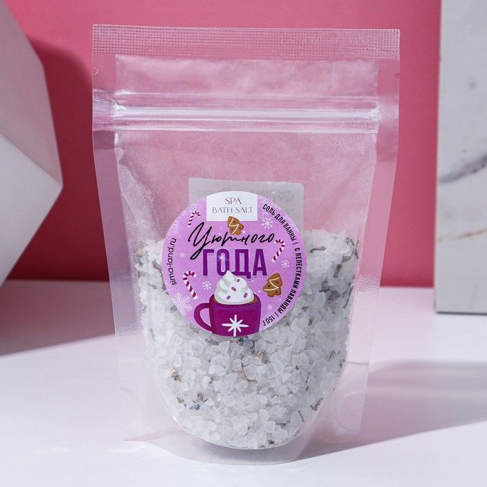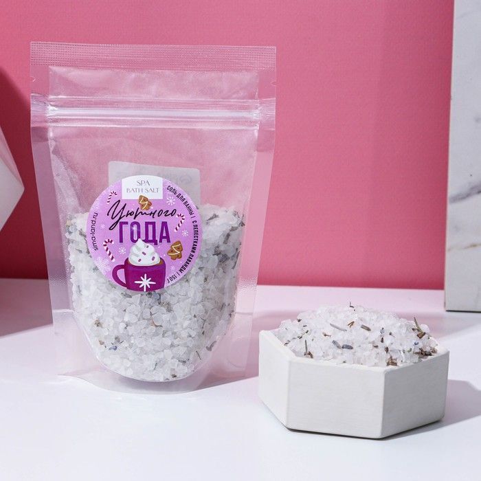 Соль имеет белый цвет с нежными фиолетовыми вкраплениями, что делает её визуально привлекательной. Упаковка выполнена в виде прозрачного пакетика с застежкой, что обеспечивает удобство хранения и использования. Не упустите возможность сделать ваши вечера более уютными и расслабляющими с солью для ванны «Уютного года»!