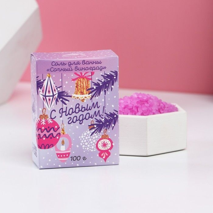 Объём упаковки составляет 100 г, что идеально подходит для одной расслабляющей ванны. Соль имеет розовые кристаллы, которые добавляют эстетическую привлекательность. Упаковка выполнена в светлом пурпурном цвете с праздничными элементами, что делает её отличным подарком для друзей и близких.