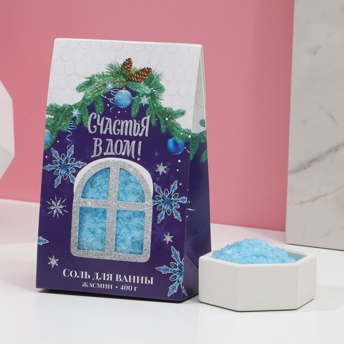 Объем упаковки составляет 400 г, что позволяет использовать соль несколько раз. Упаковка выполнена из картона и оформлена в темно-синих тонах с новогодними мотивами, что делает её отличным подарком. Срок годности соли составляет 36 месяцев, а хранить её рекомендуется при температуре не выше 40 °C, защищая от прямых солнечных лучей.