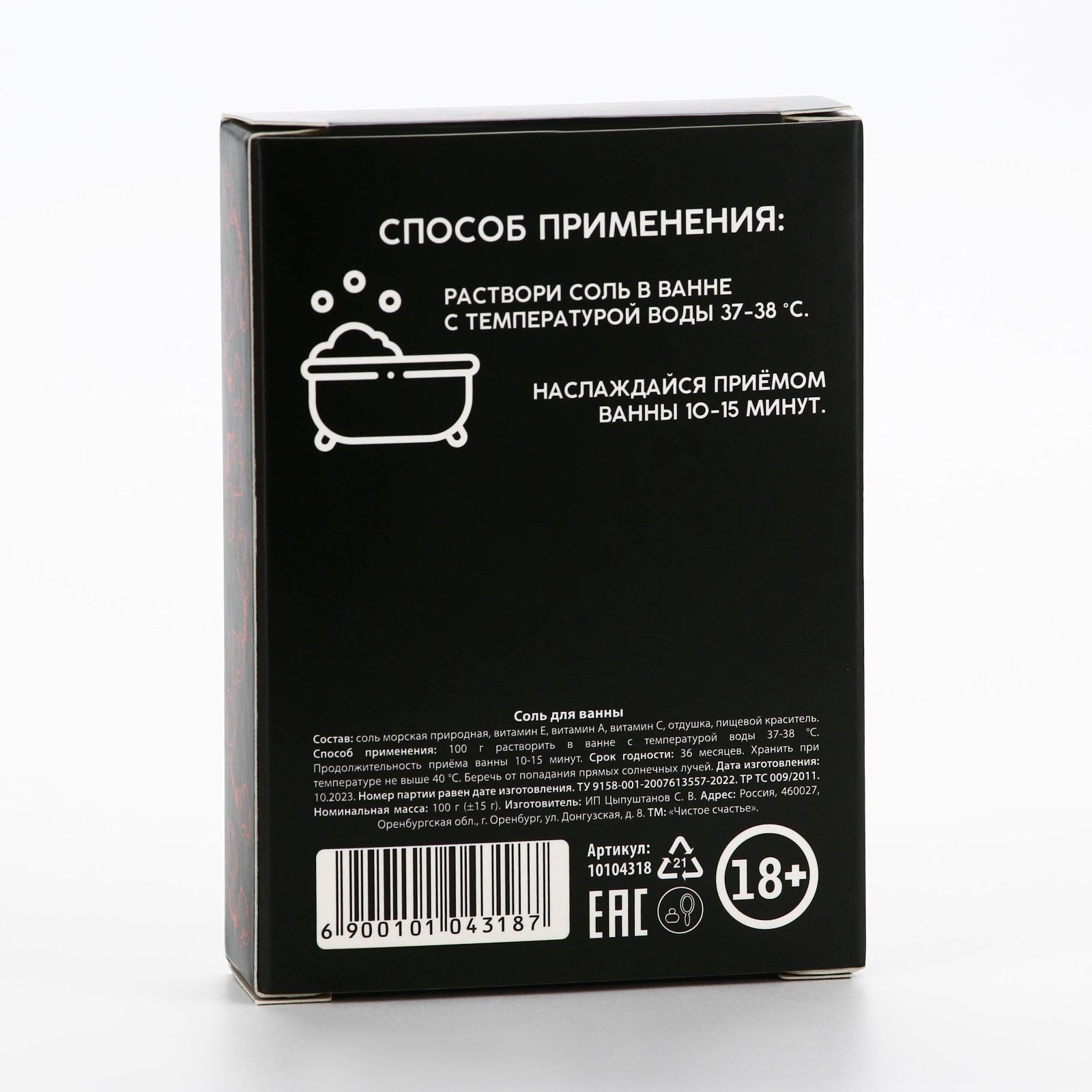 Черная матовая упаковка с элементами красного сохраняет содержимое сухим и защищенным от света. Предупреждающая маркировка 18+ делает продукт идеальным выбором для тематических подарков.