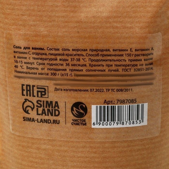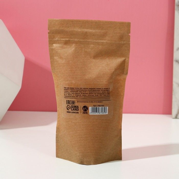 Объем упаковки составляет 300 г, что достаточно для нескольких расслабляющих процедур. Упаковка выполнена из крафт-материала с прозрачной вставкой, через которую видна оранжевая соль. Срок годности соли составляет 36 месяцев, что позволяет вам наслаждаться ею долгое время. Храните соль в сухом месте, защищенном от солнечных лучей, при температуре не выше 40°C.